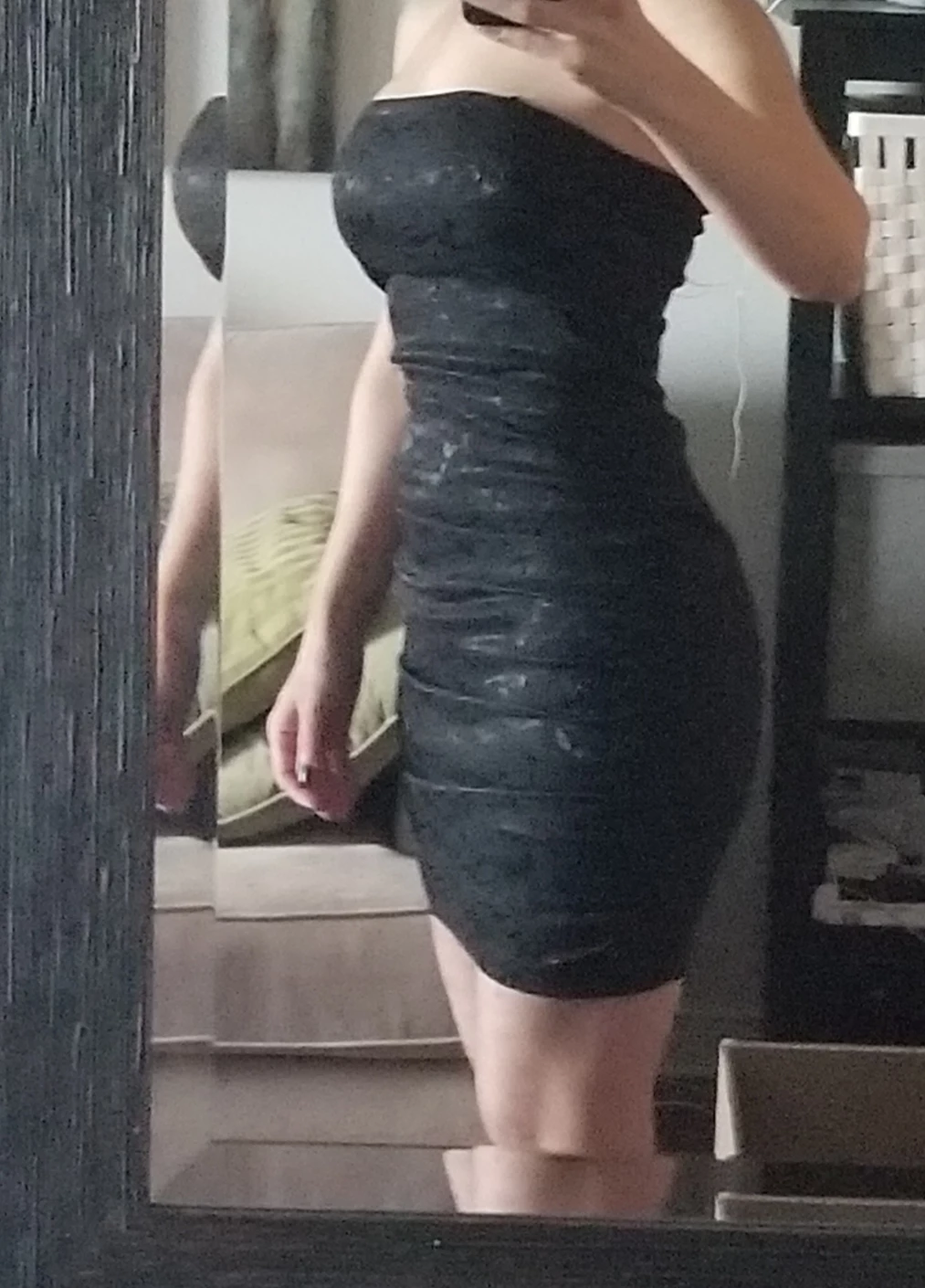 The GORGEOUS black mini dress will help you own the night! It has gathered sides and an embelished floral pattern in black to add a bit of shine and texture. Can be worn as a strapless dress or you can add the attachable staps which are included in the attached bag.