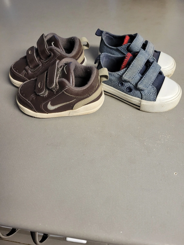 I have 2 pairs of toddlers, size 4 velcro shoes. both have been slightly worn. 1 is a brown pair of NIKE shoes. The other is a denim pair. Both are still in good condition.