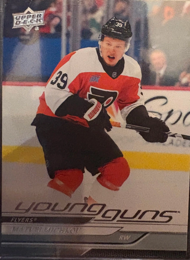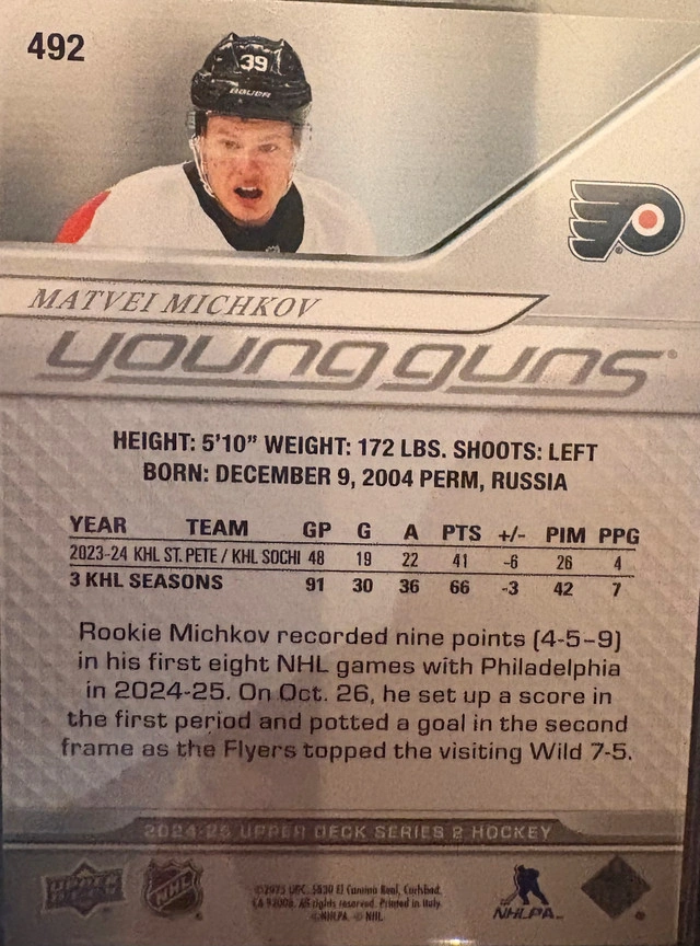 Get your hands on this Matvei Michkov Young Guns rookie card from the 2024-25 Upper Deck series! This collectible card features a crisp image of the Flyers prospect, ready to make his mark on the NHL. Being a collector's item, it's in great condition, perfect for any hockey card enthusiast. Asking $50.