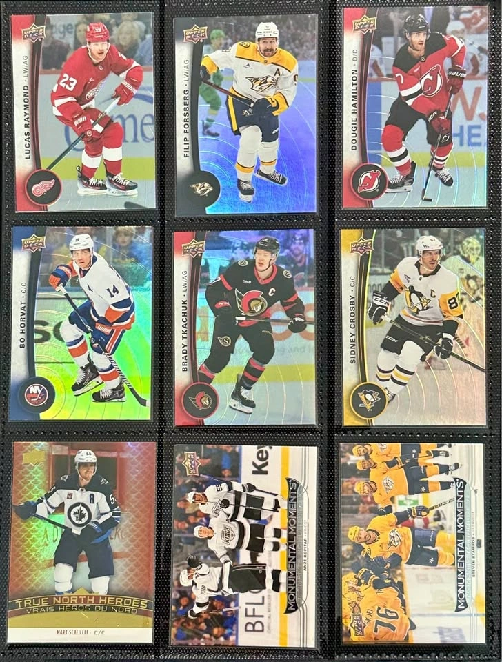75Cards are new and put into sleeves immediately after being pulled. $1 each: - Lucas Raymond (Base) - Filip Foraberg (Base) - Dougie Hamilton (Base) $3 each: - Sydney Crosby (Base) - Brady Tkachuk (Base) - Mark Schifele (TNH) - Anze Kopitar (MM) - Steven Stamkos (MM)
