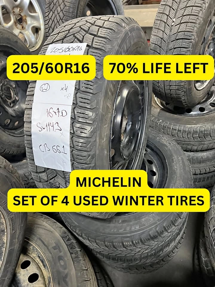 15Set of 4 used Michelin X-ICE Snow winter tires, size 205/60R16, with 70% life left. Rims are not included. Installation and balancing on your existing rims is included. HST is added at checkout. We also stock a wide selection of new and used alloy and steel wheels. To ensure a perfect fit for your vehicle, please provide your make, model, and year, and we’ll offer you a range of options tailored to your budget. 30-Day Satisfaction Warranty on all used tires Feel free to message if you have any questions!