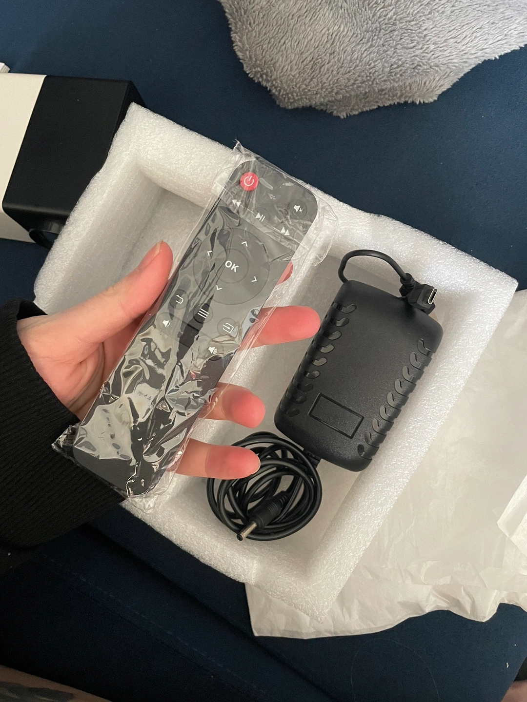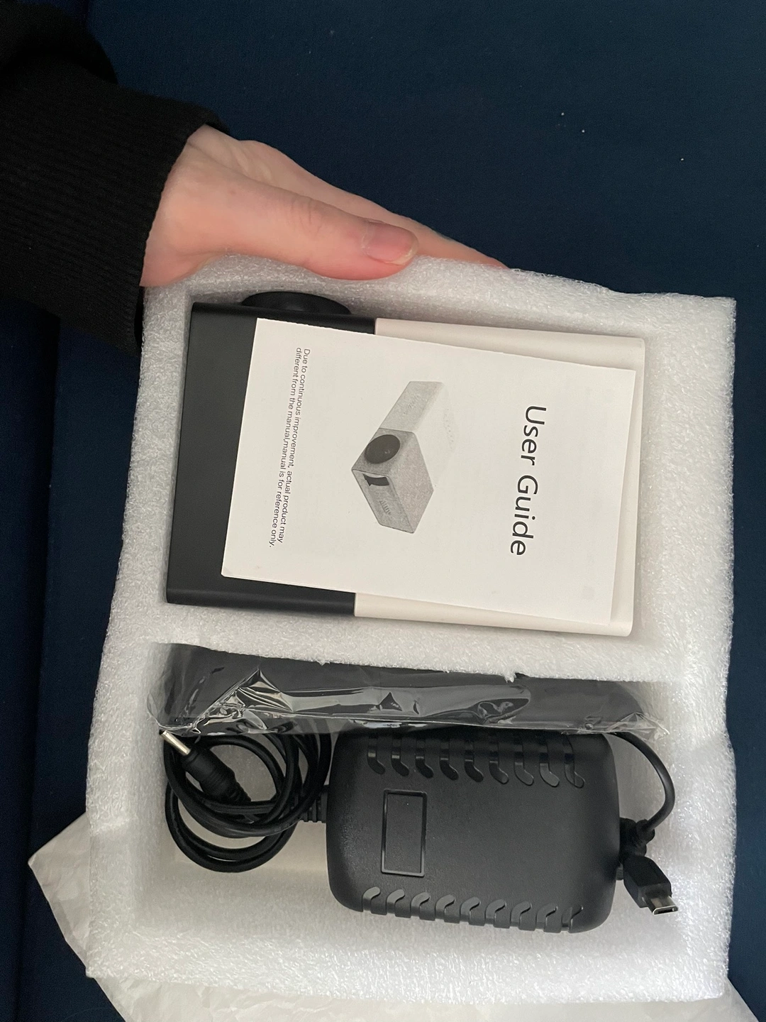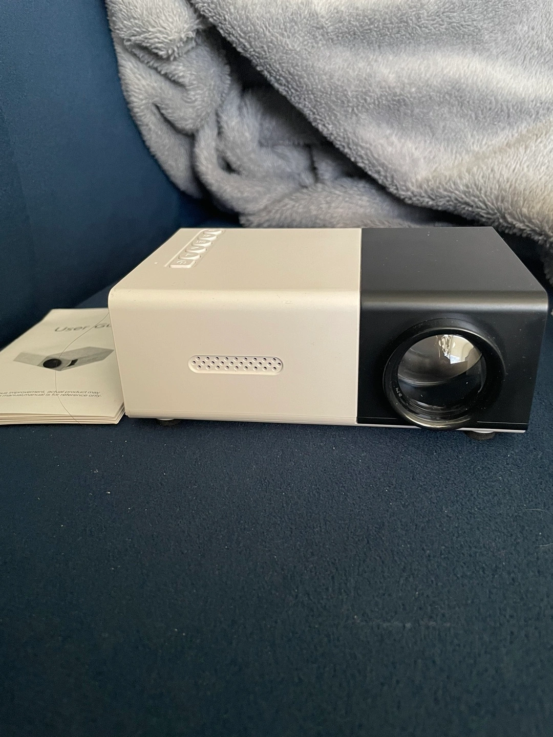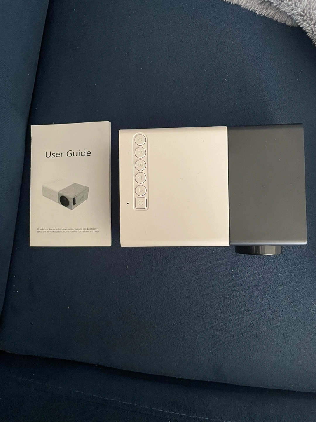 Comes with the projector itself, remote, charger, user guide, and a small cord.