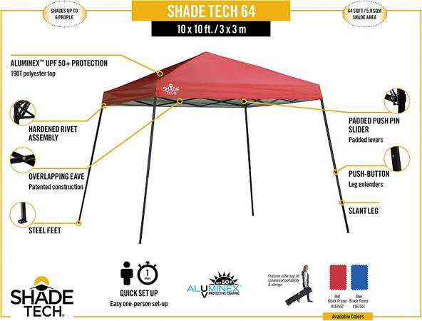 Shade Tech affordable, quality canopy offers reliable shade where you need it with this reliable slant leg pop-up canopy. Features 3 height positions for variations, a rigid eave construction and shade up to 64 sq. ft. Our Aluminex fabric offer 99% UV protection and the push button sliders with padded levers make this canopy easy to assemble.
