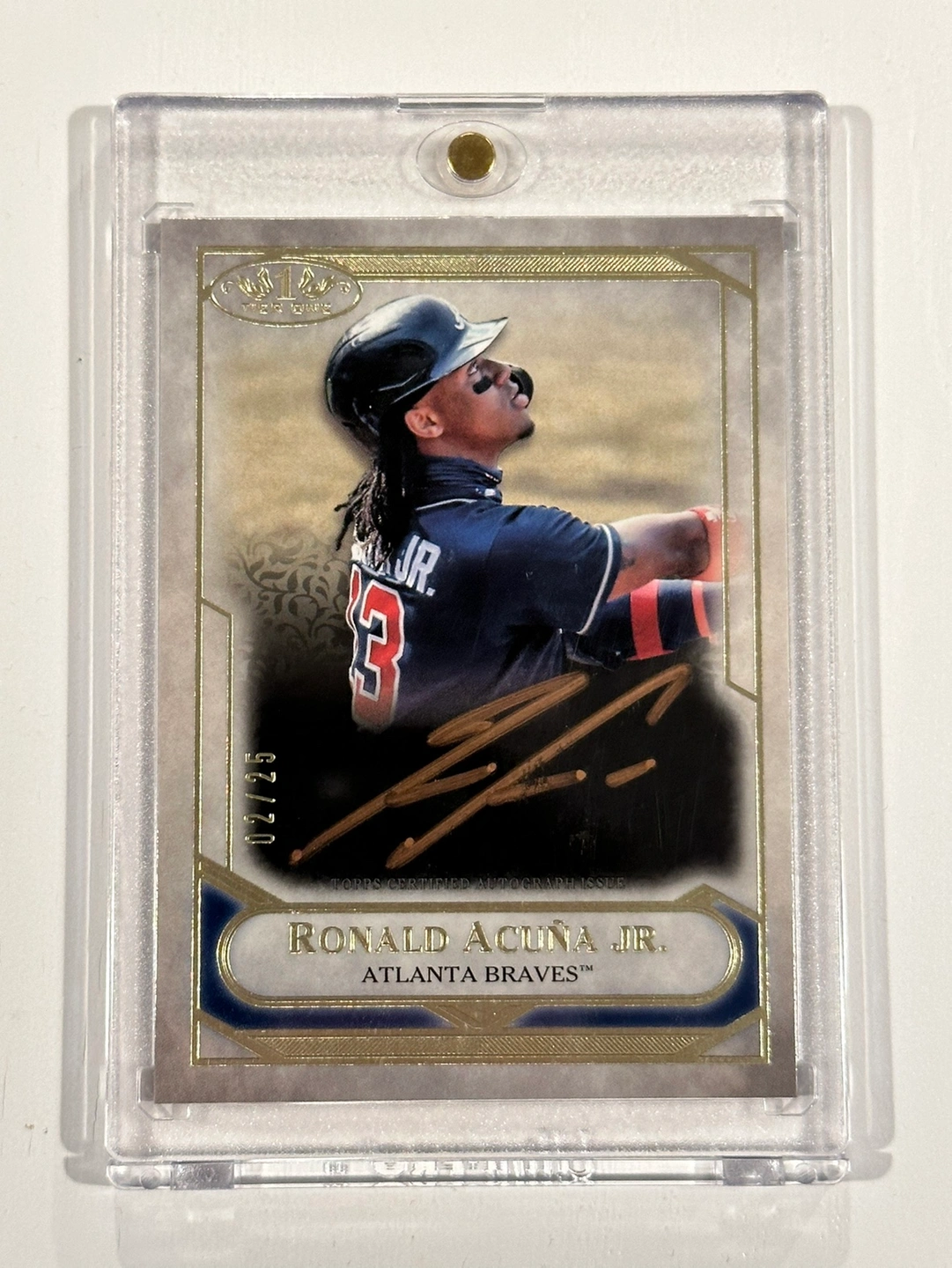 Get your hands on this rare 2021 Topps Tier One Ronald Acuna Jr Autograph card, numbered out of only 25. This highly sought-after sports trading card is a must-have for any Atlanta Braves fan or baseball card collector.