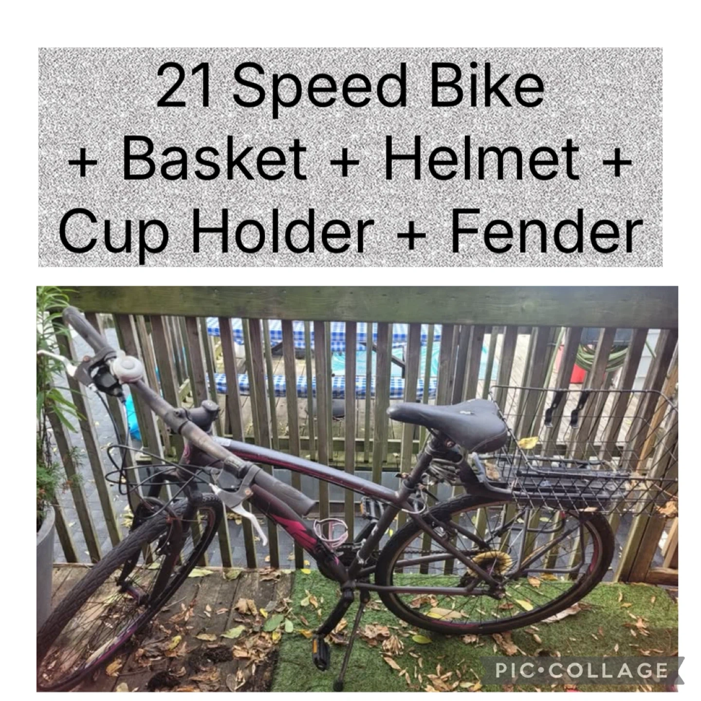 83Selling a 21-speed bike! Good for use but rear break needs to be changed. It comes with some great accessories to make your rides even better. - Basket for carrying groceries or your picnic lunch - Helmet for safety - Cup holder to keep you hydrated on the go - Fender to protect you from splashes - Pump