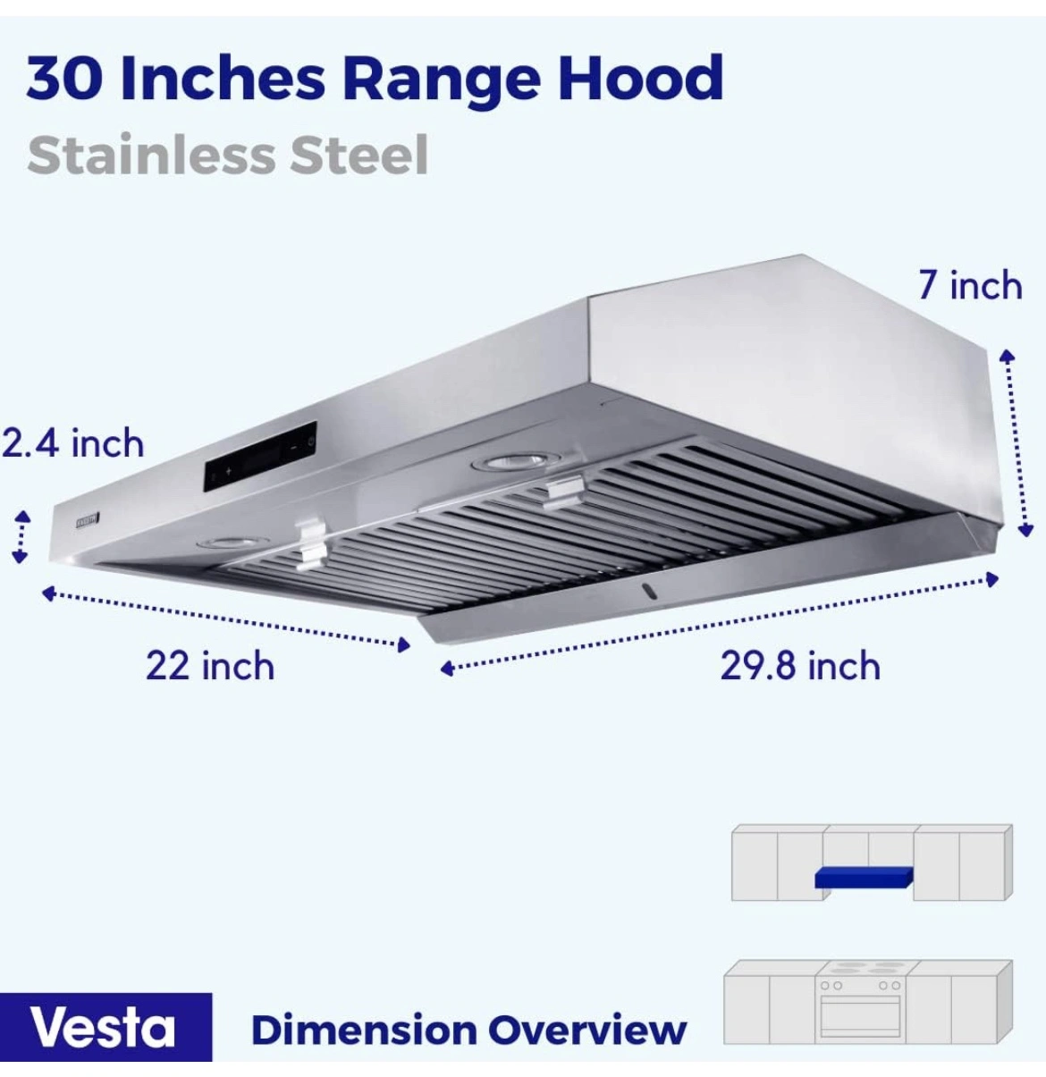 Vesta Atlanta 860CFM 30'' Stainless Steel Under Cabinet Range Hood With Dual Motor, Contemporary Design, Pro Performance, 6 Levels Of Speed, Touch Screen,LED Lights, Baffle Filters, And Oil Tray