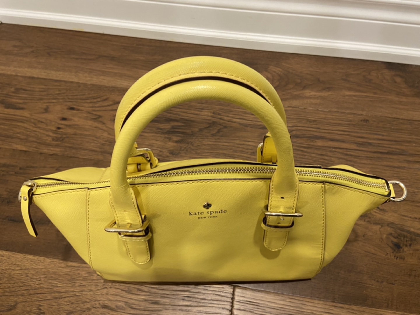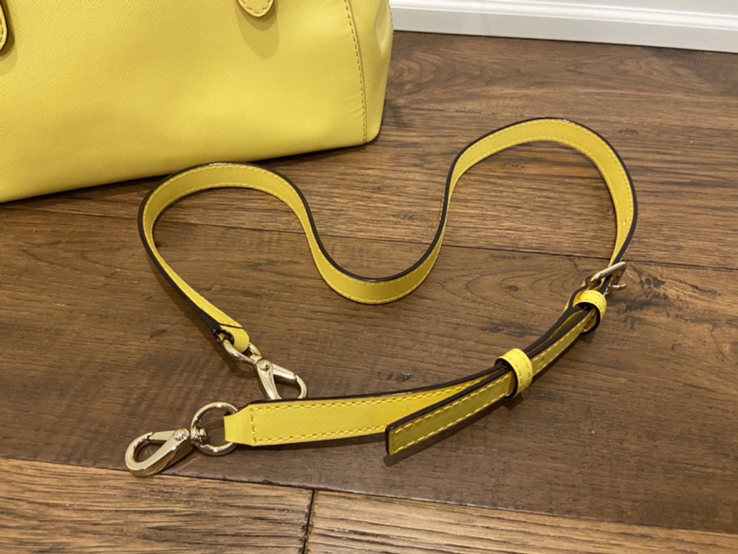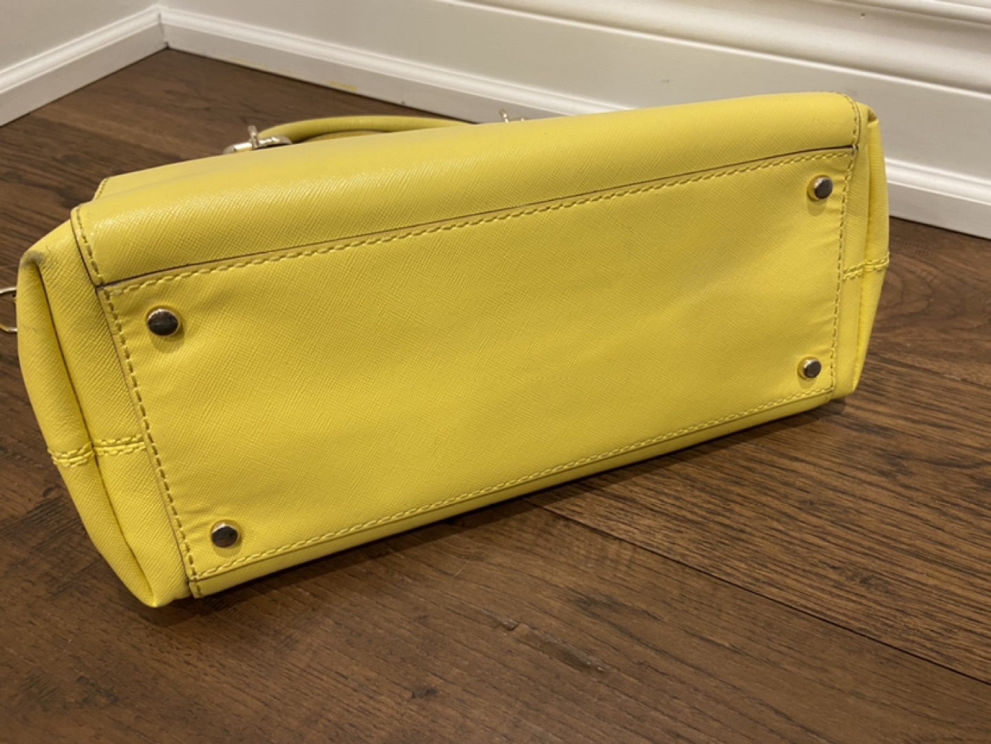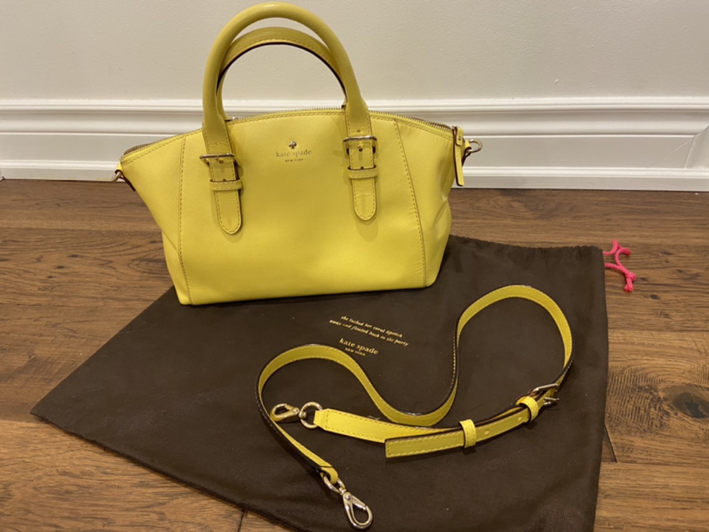 151Authentic boutique Kate Spade purse, not from the factory outlet! (Last photo shows gold Kate Spade charm, not printed) Medium sized satchel with detachable crossbody strap. 100% cow leather in bright lemon yellow Excellent condition, a few crease marks from use over time, no stains or frayed edges. Original dust bag included.