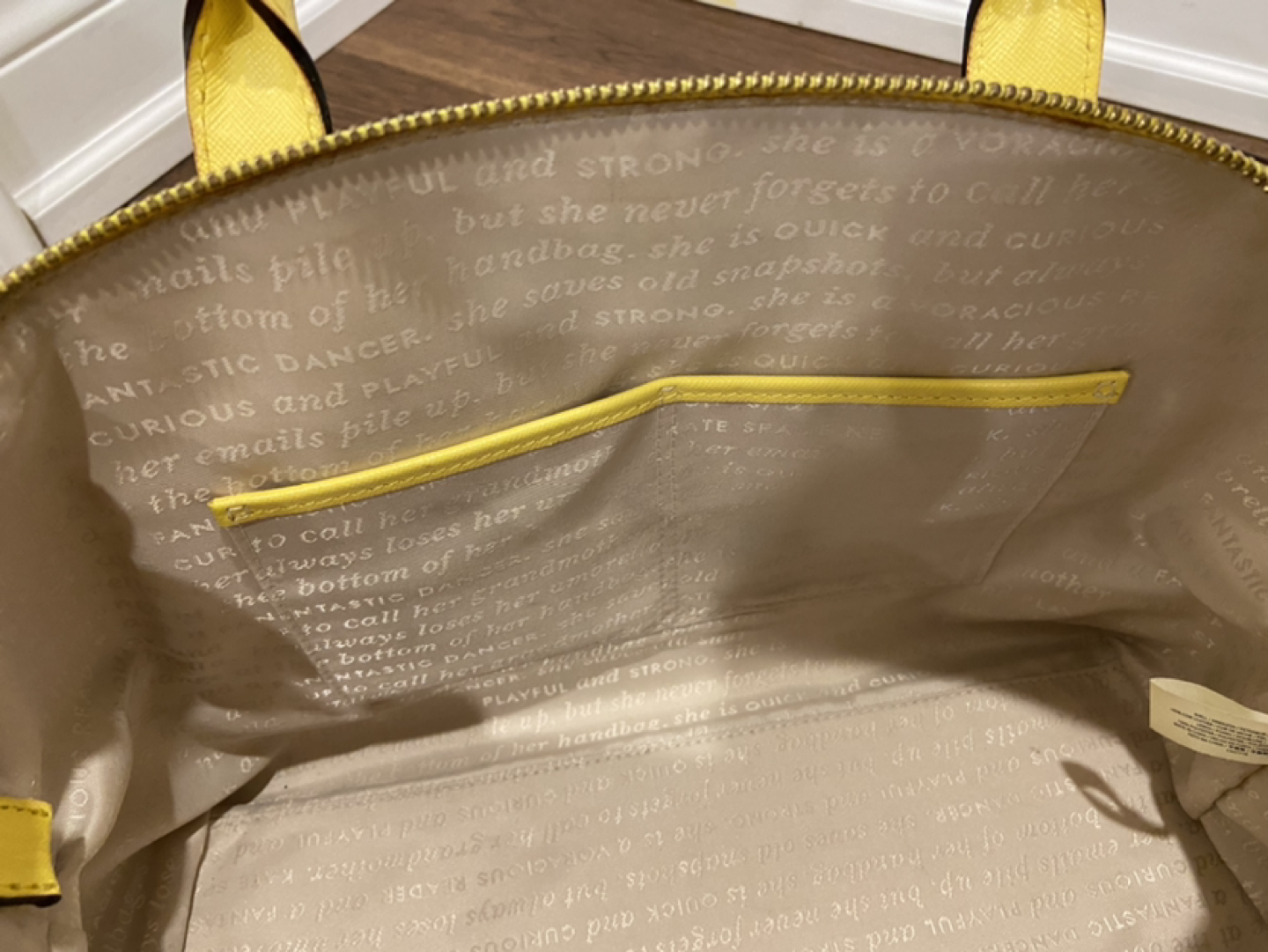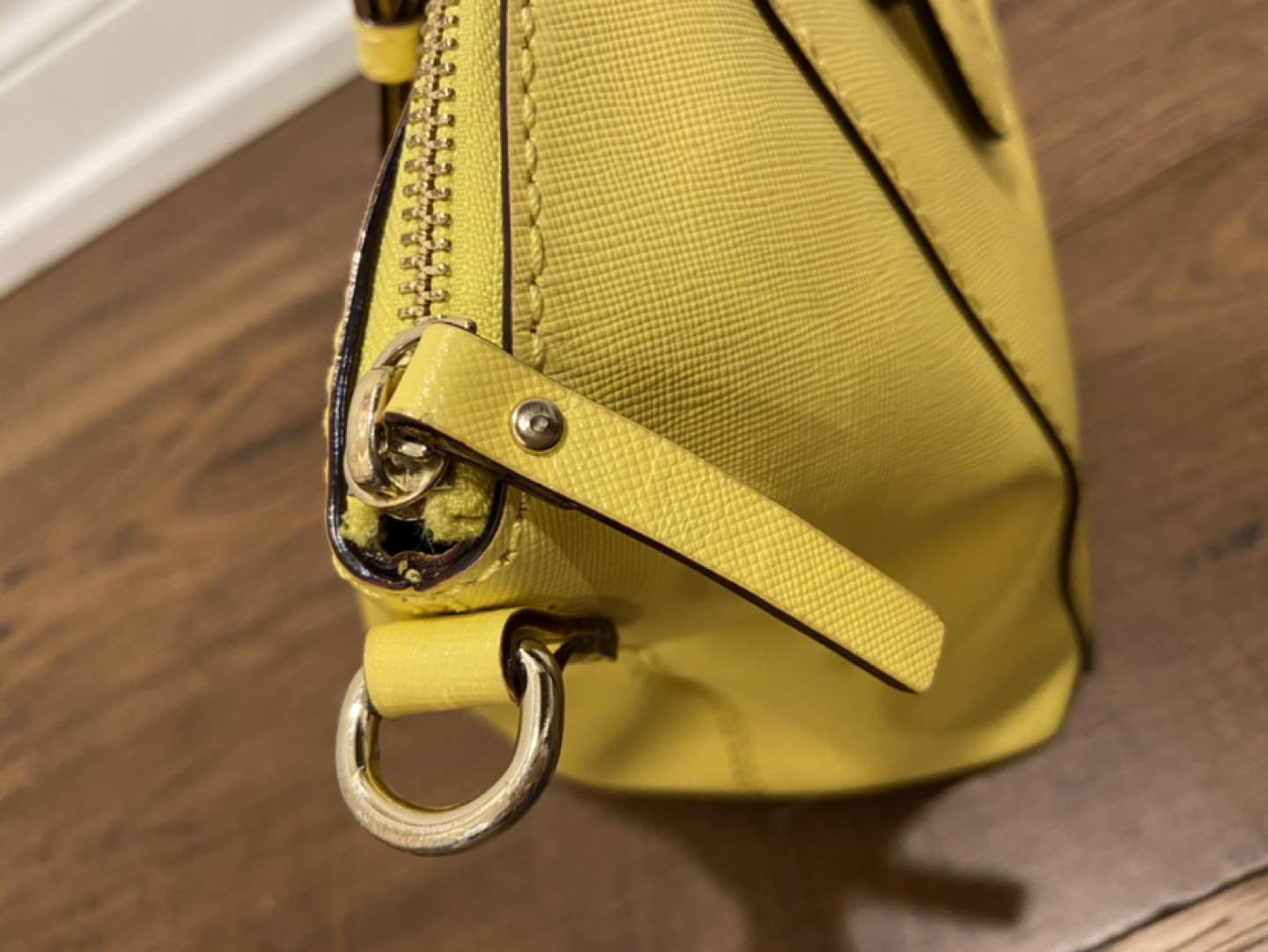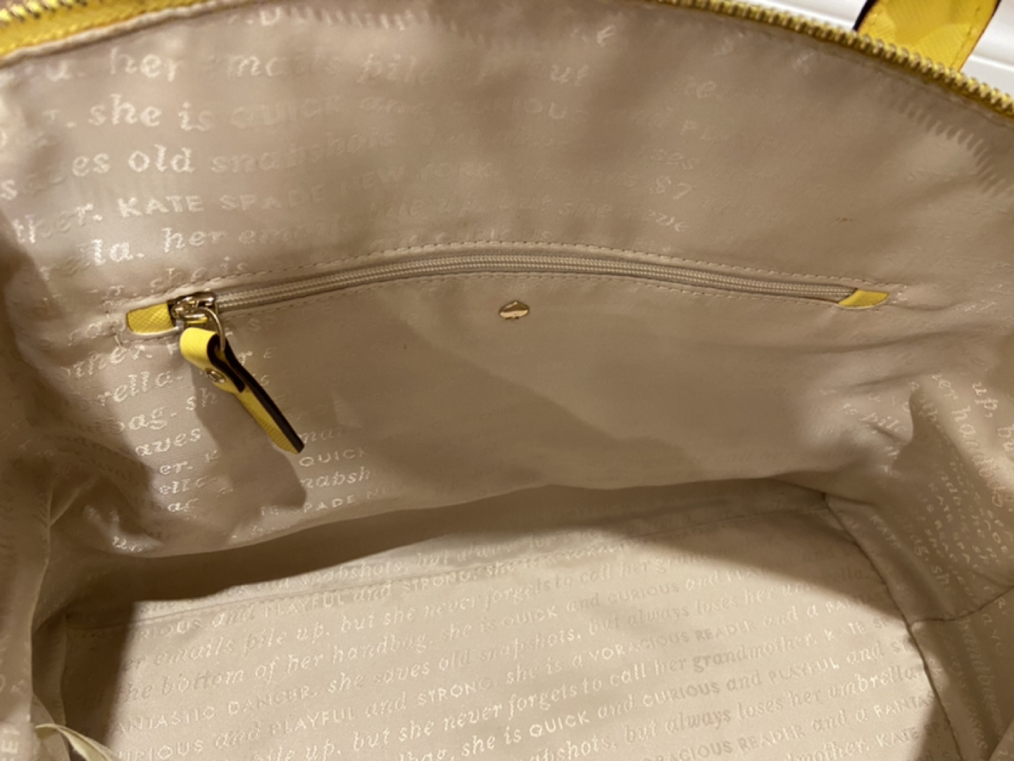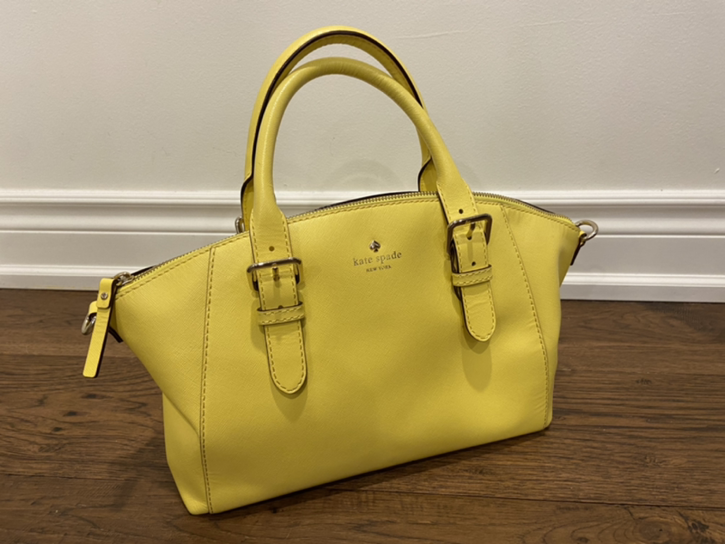 151Authentic boutique Kate Spade purse, not from the factory outlet! (Last photo shows gold Kate Spade charm, not printed) Medium sized satchel with detachable crossbody strap. 100% cow leather in bright lemon yellow Excellent condition, a few crease marks from use over time, no stains or frayed edges. Original dust bag included.