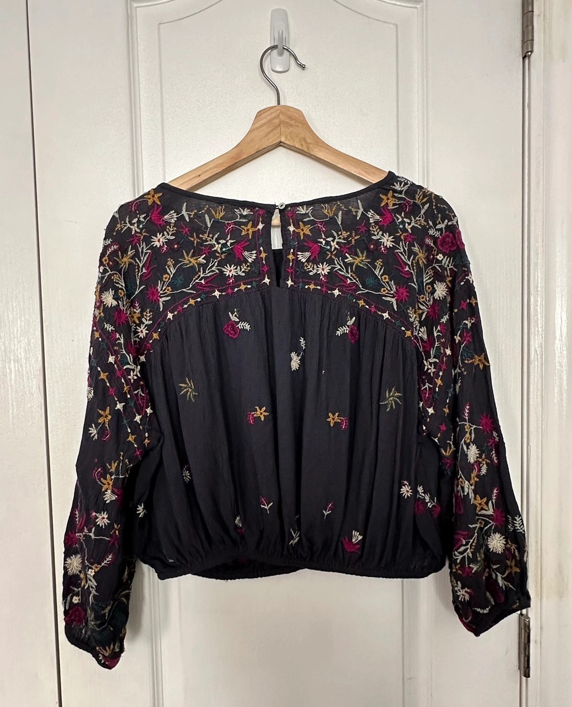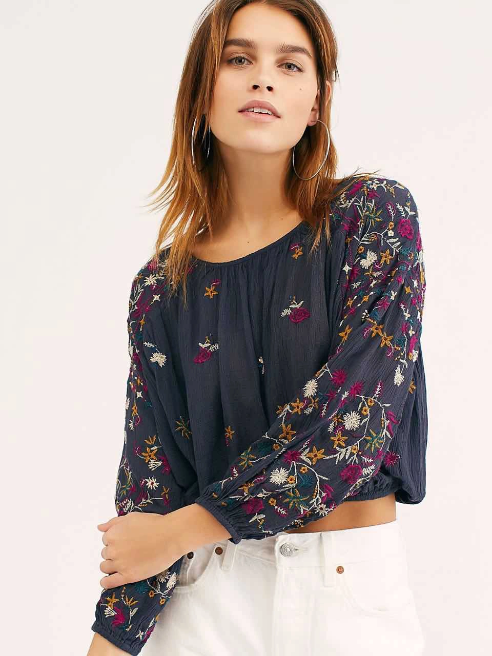 Boho-inspired lightweight semi-sheer blouse featuring allover colourful floral embroidery detailing.