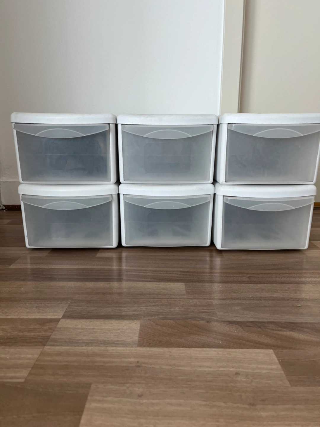 Six white exterior individual plastic drawers that can be stacked. Very useful wherever you need storage or as an organizer.