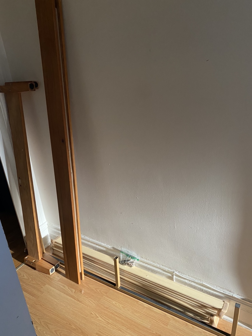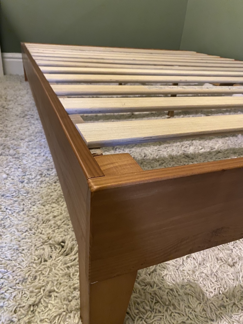35Teak coloured queen sized platform bed. The Maxen Platform bed from Wayfair. Originally paid $300. Asking $50 cash. Exactly dimensions of a Queen mattress. Already disassembled and ready to go!