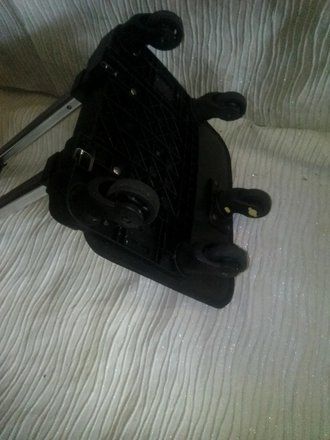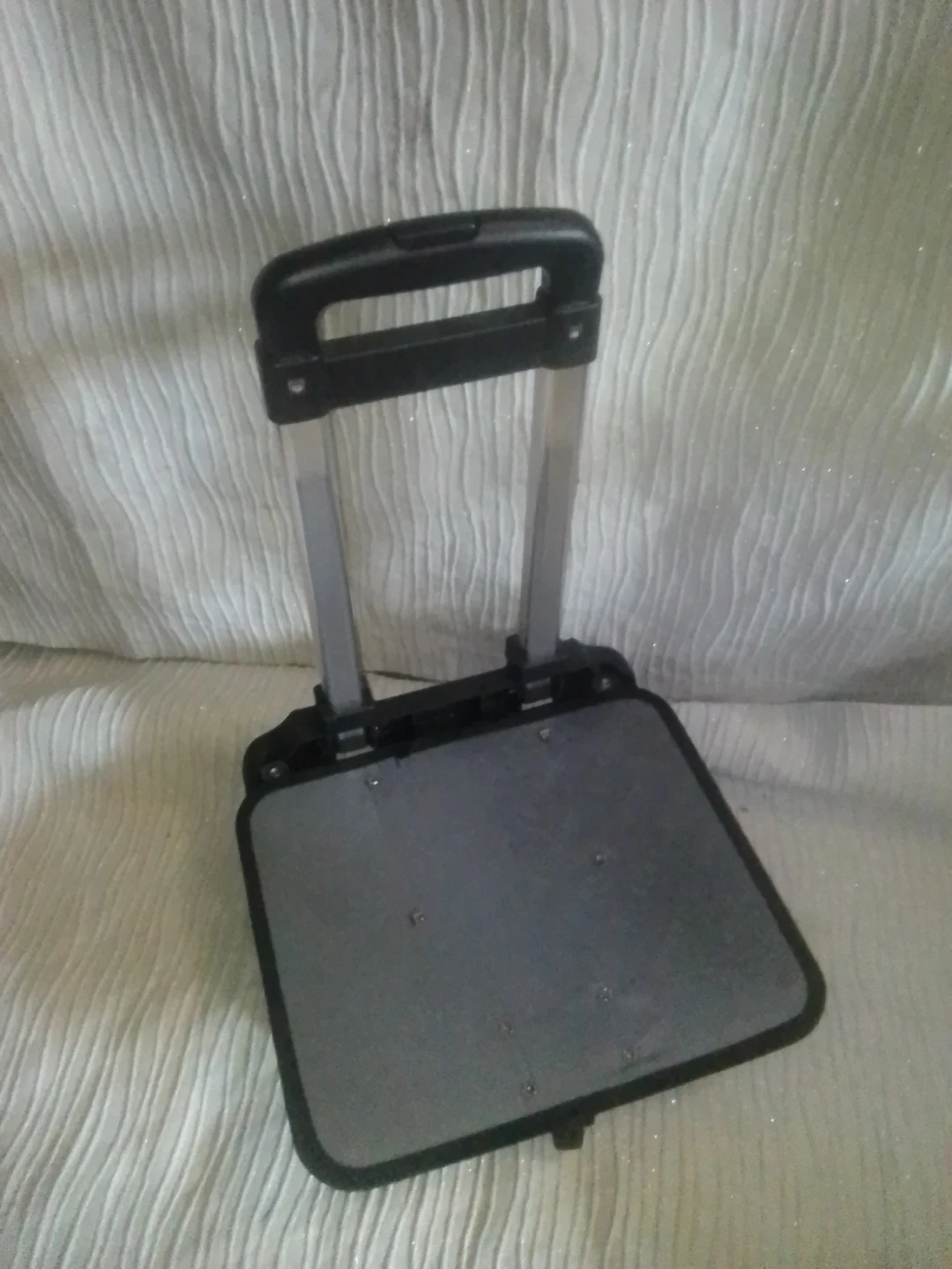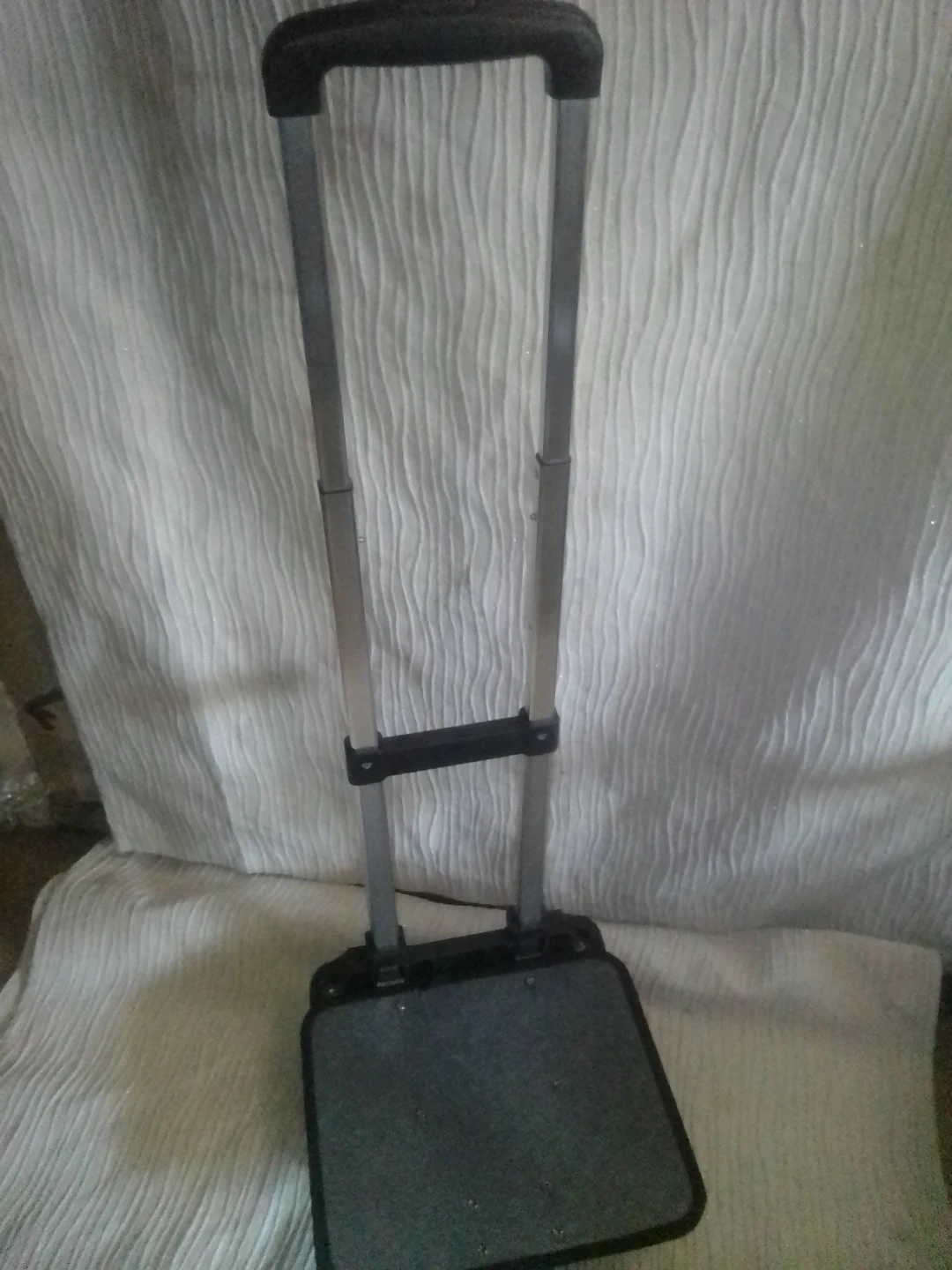 This is a folding luggage cart with an extendable handle and wheels. It's designed for easy transport of Pet carriers. Sturdy construction for reliable use.