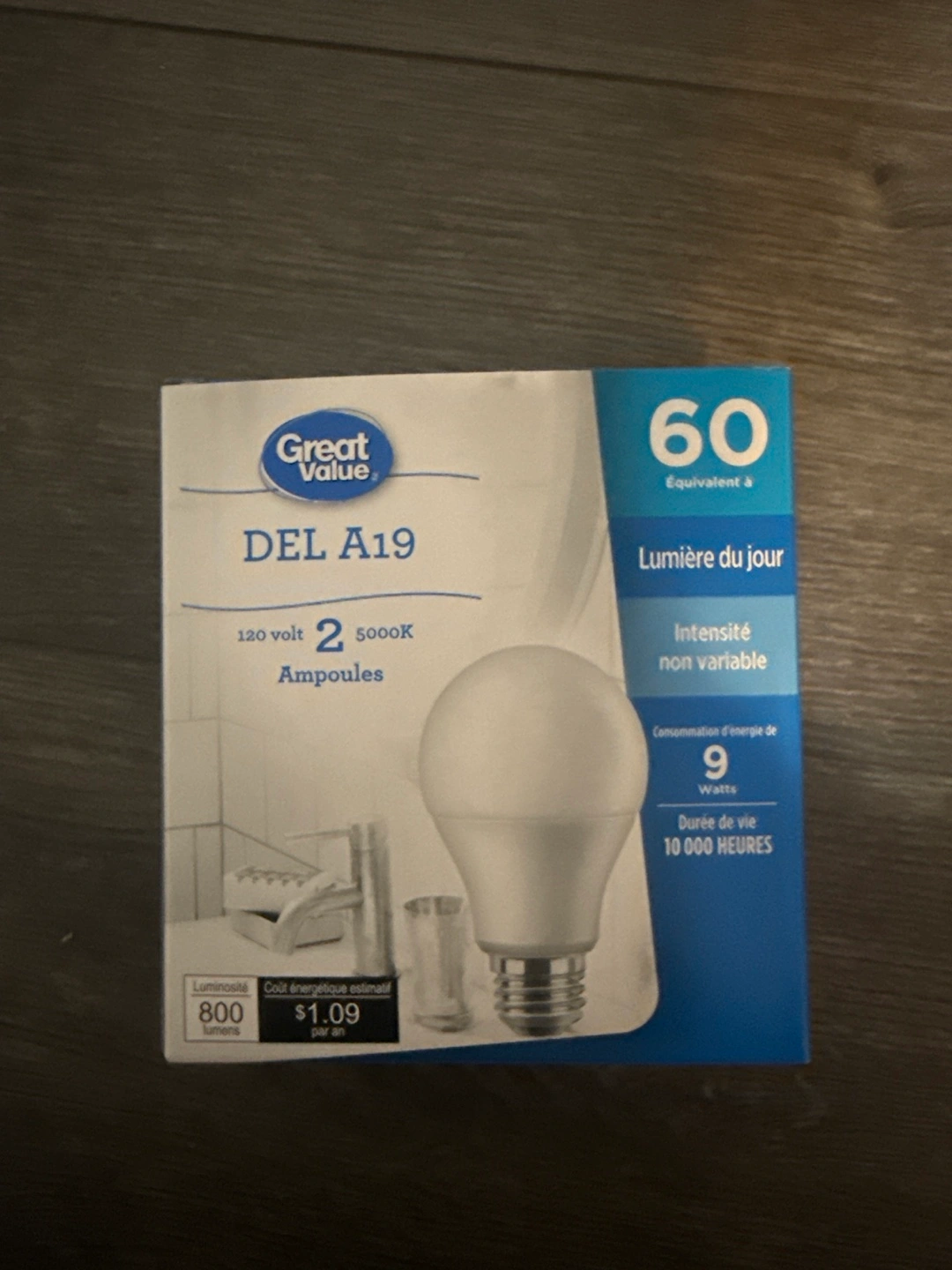 Selling a Great Value DEL A19 LED light bulb. It's equivalent to a 60W incandescent bulb but only uses 9W of power.
