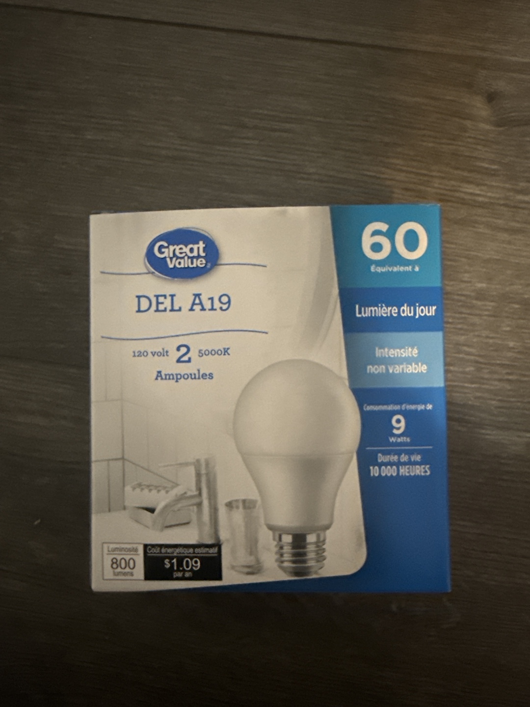Selling a Great Value DEL A19 LED light bulb. It's equivalent to a 60W incandescent bulb but only uses 9W of power.