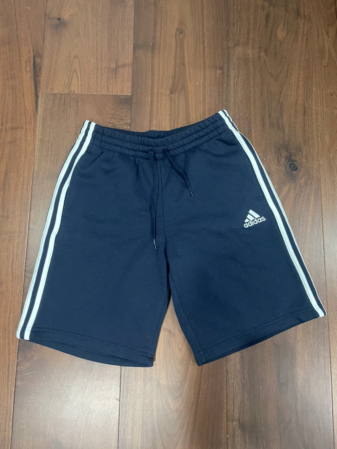 Selling navy blue adidas shorts. Stored in a smoke-free home. They fit more on the baggier side and fit at knee length