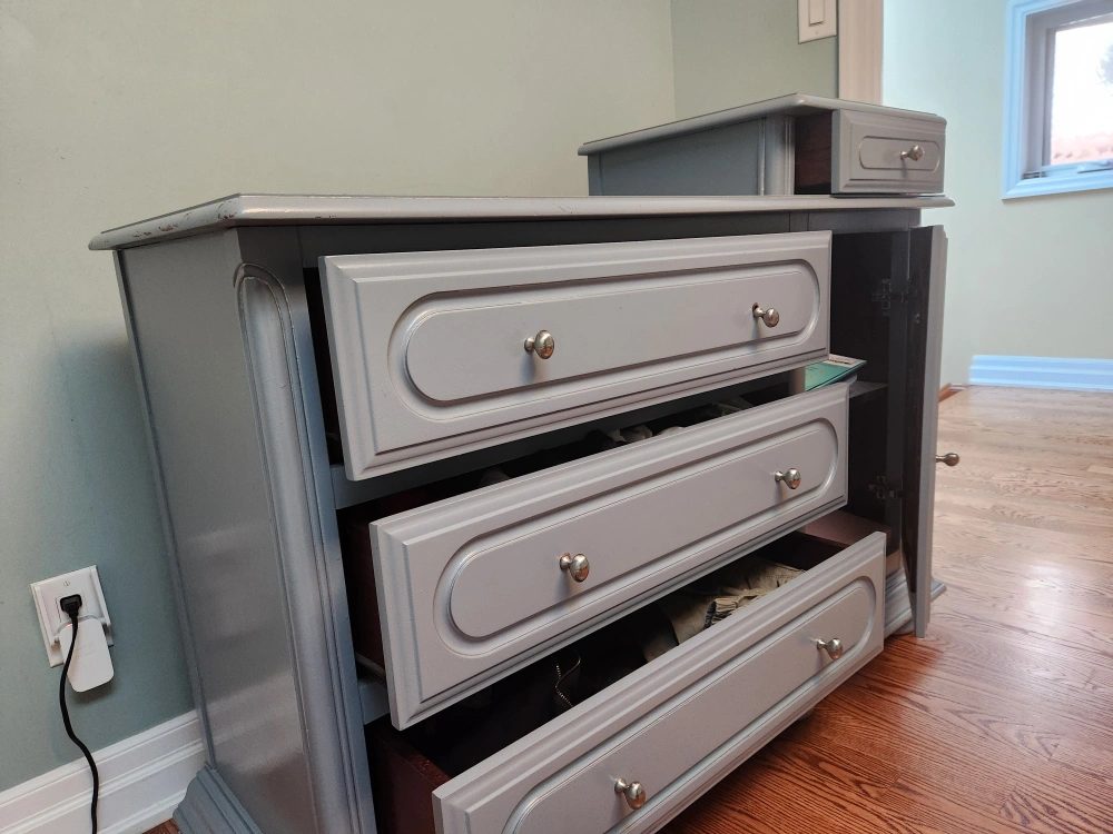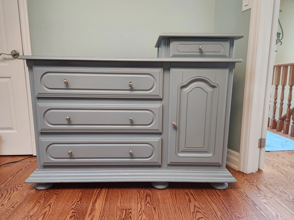 Solid wood dresser with so much storage! 3 large drawers, a smaller drawer and a cupboard with 2 shelves. This could also be used as a baby change table. This is very heavy. The build on this piece is solid! A few pin drop size paint scratches. Yet its in amazing condition! Delivery available for extra fee only around GTA. Asking $50 or reasonable offers.