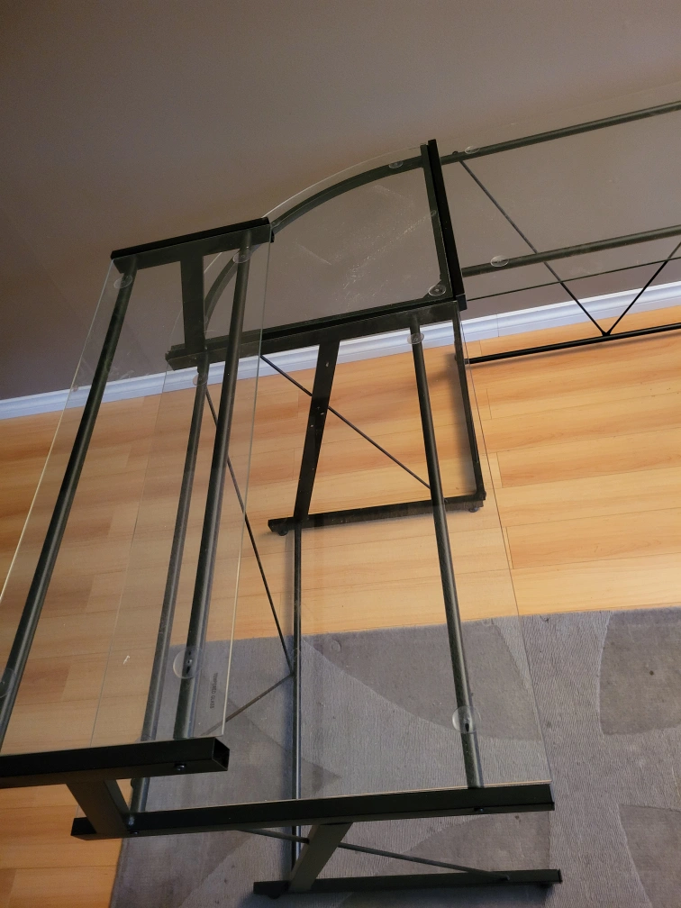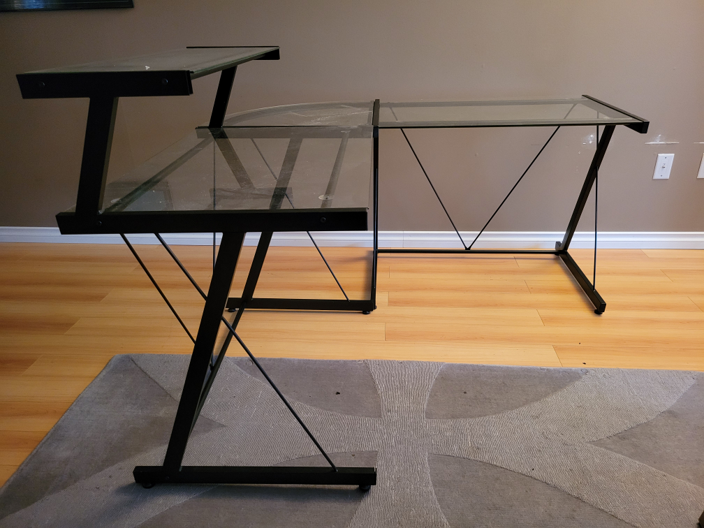 L shaped glass desk. One side is tiered, and can be changed to the opposite side.