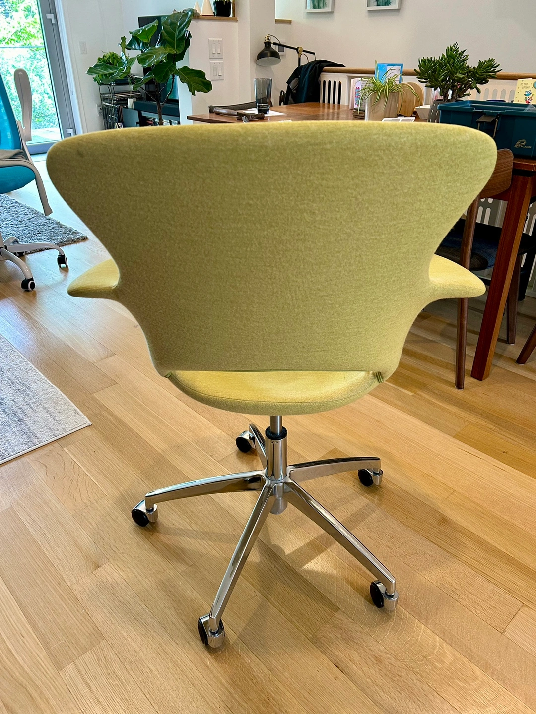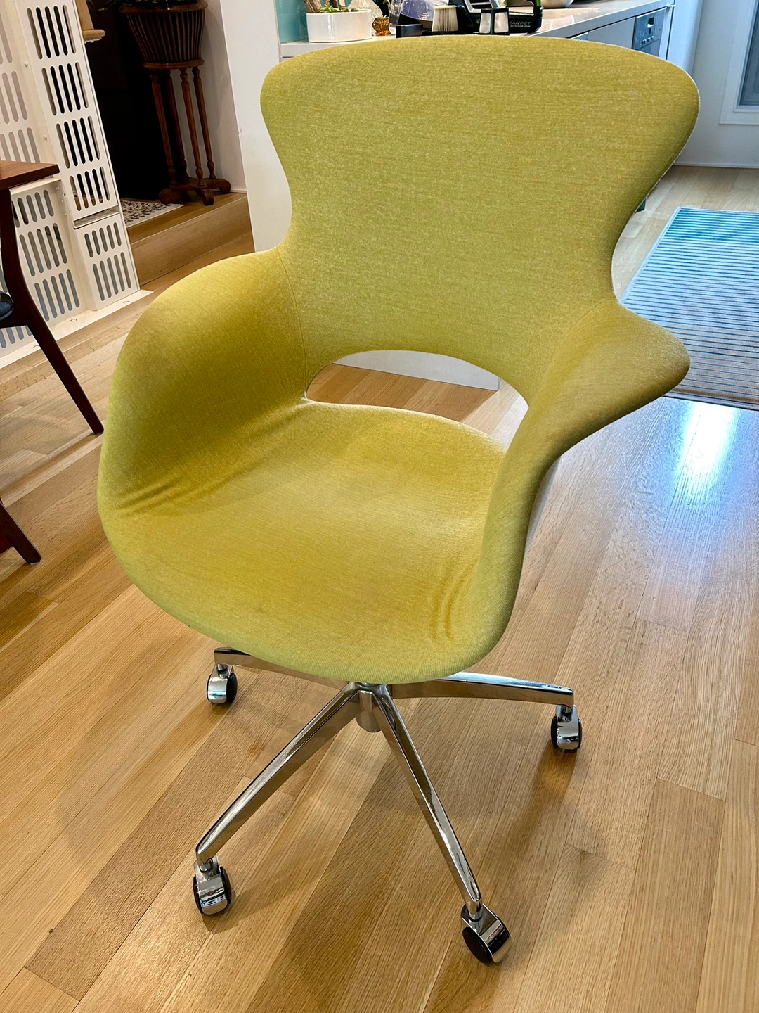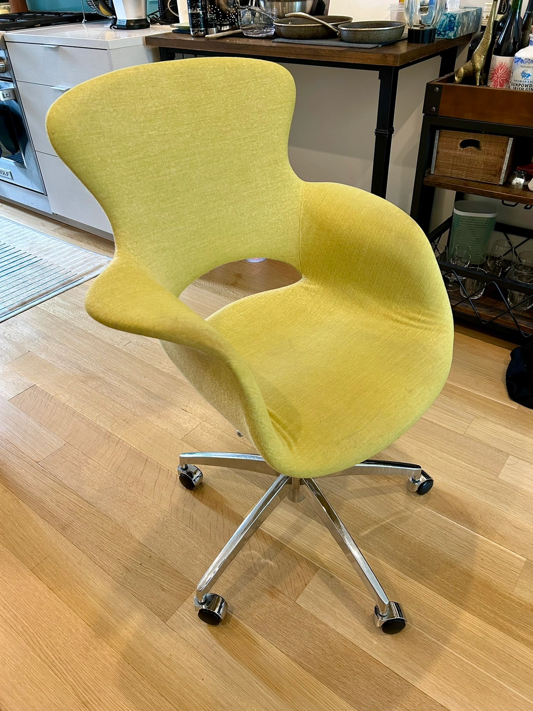 Up and down adjustable height, swivel chair on wheels. Solid metal base and high quality fabric. In good condition - just getting rid of because we bought an ergonomic office chair.