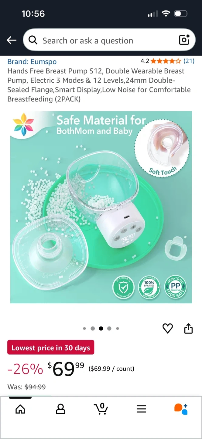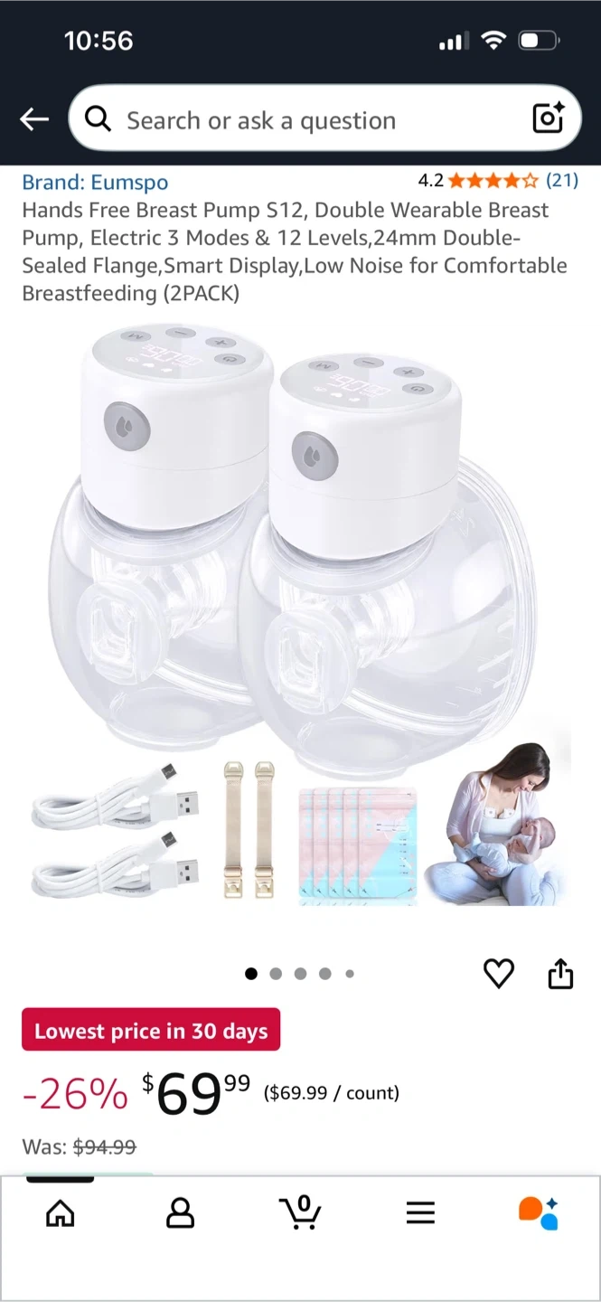 This is a 2-pack of Eumspo S12 wearable breast pumps. They are silent, reusable, and stress-free. Each pump has 3 electric modes and 12 levels, and includes a 24mm double-sealed flange with a smart display. It also features a longer battery life, offering 90 minutes of usage time and a 2.5-hour charging time.