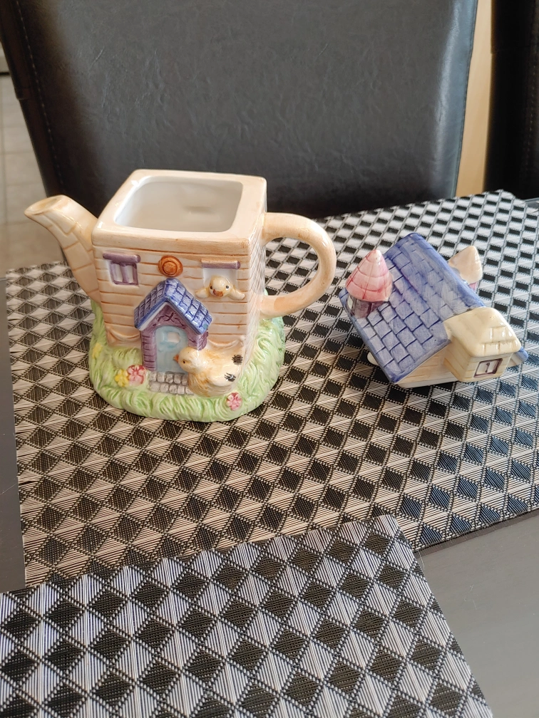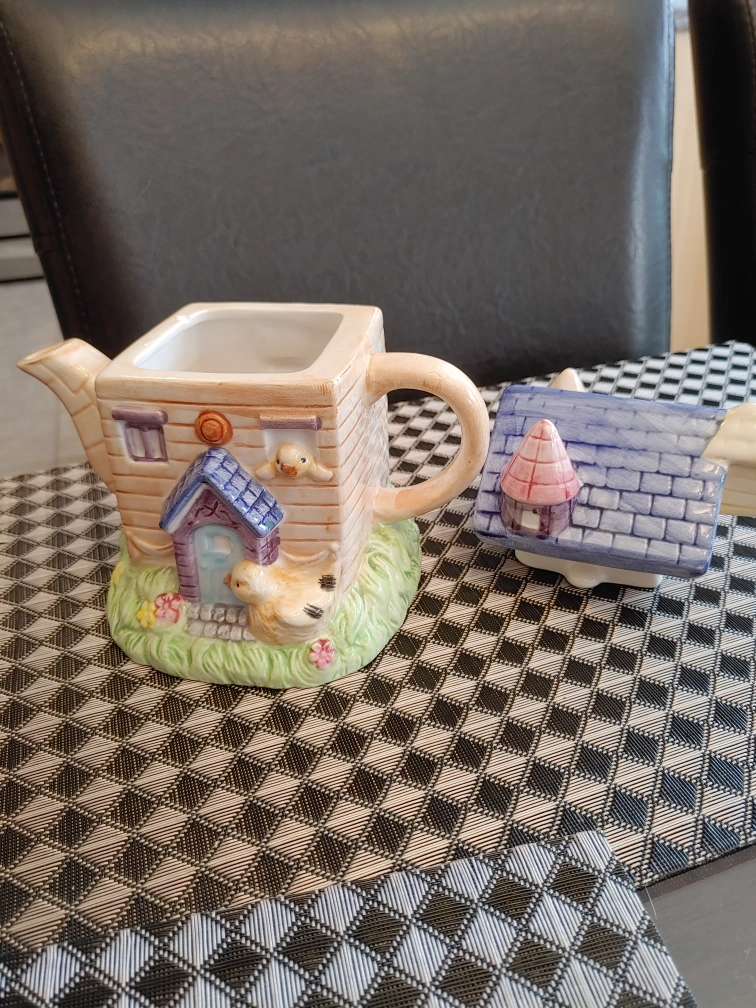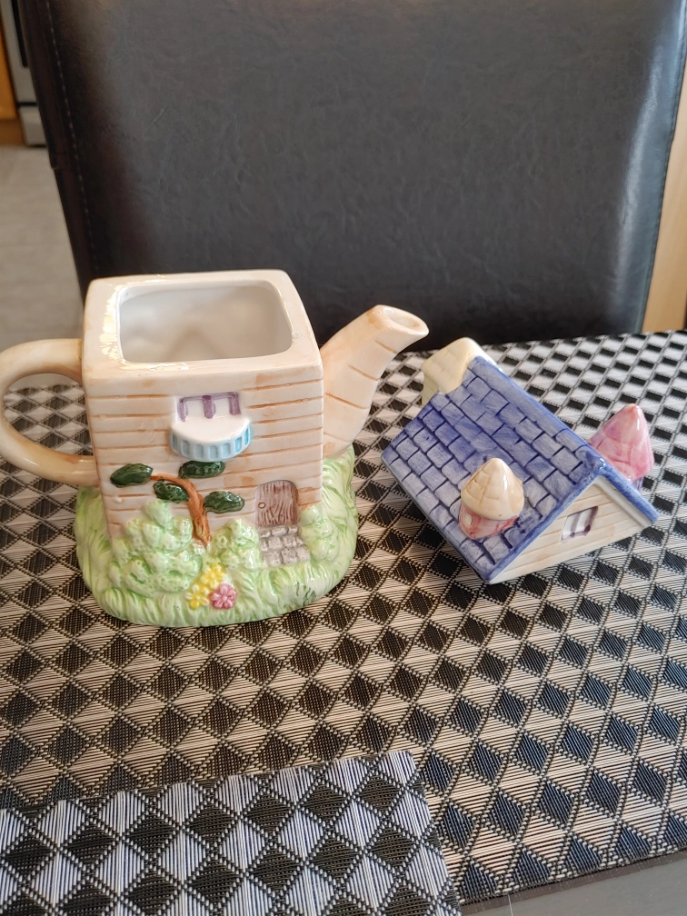 Ceramic usable tea pot of house with chicks. Fairytale design. Holds approximately two cups of tea. Used for display purposes only. There is a small chip on rim under the lid which doesn't effect it's use or esthetic since it is covered by the lid. Price is negotiable. Pick up in Meadowvale near Britannia Rd and Ninth Line.