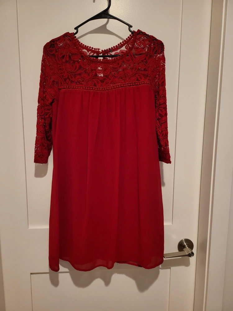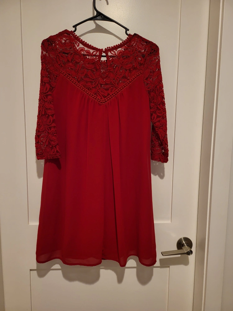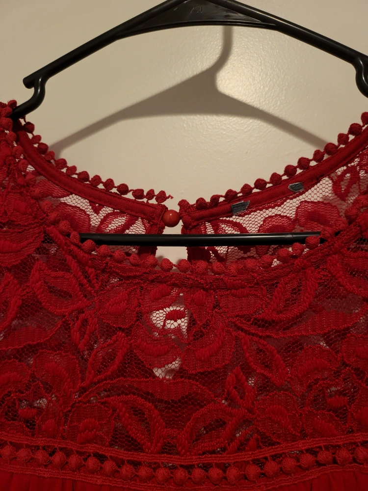 The dress will suit heights 152-164 cm - 4'9- 5'3 f. The color is red - the photo conveys the shade perfectly. The top of the dress and sleeves are made of lace fabric. Button closure at the back. No lining. The dress looks stylish with a leather jacket - example in the photo.