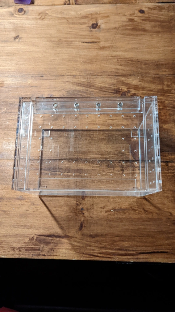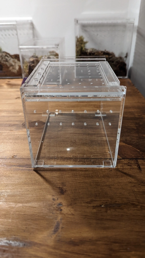 4x4x6 inch Tarantula cribs with sliding top and magnetic lock. These provide great ventilation, easy feeding and secure tops to avoid escapees!