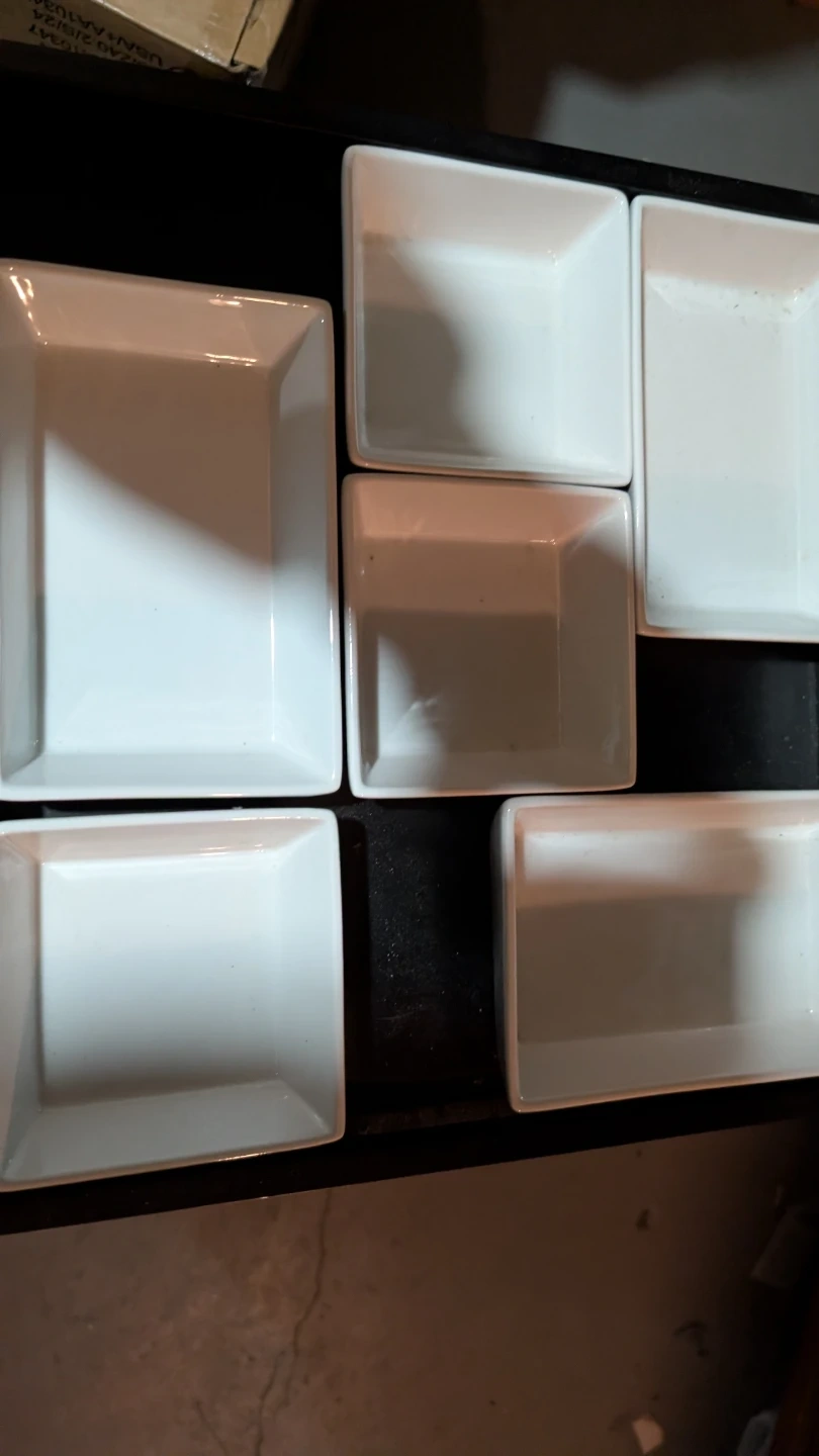 A set of six white dishes, suitable for ramekins or serving small portions. They're made of ceramic material. Great for appetizers or individual desserts!