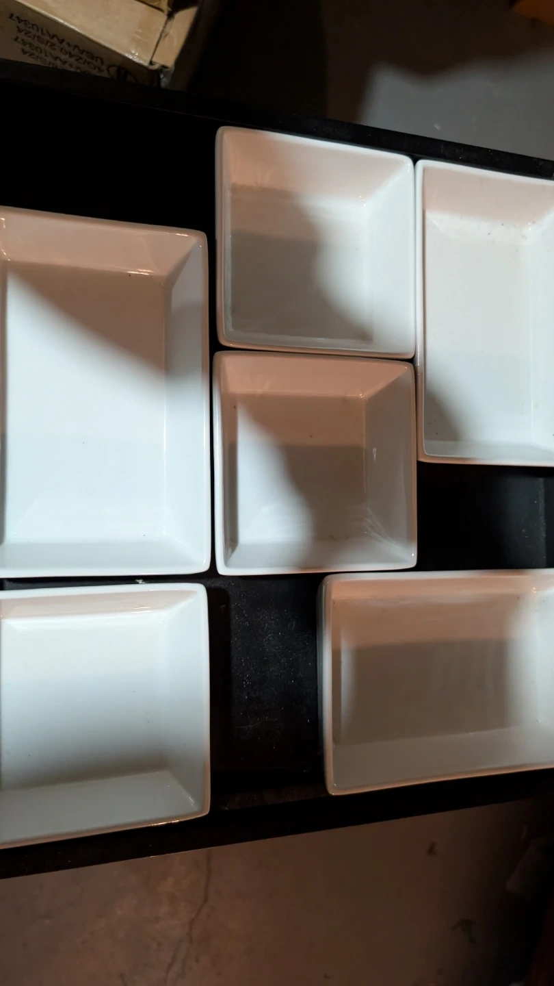 A set of six white dishes, suitable for ramekins or serving small portions. They're made of ceramic material. Great for appetizers or individual desserts!