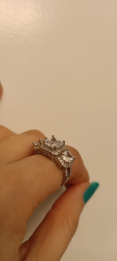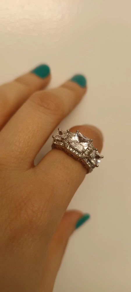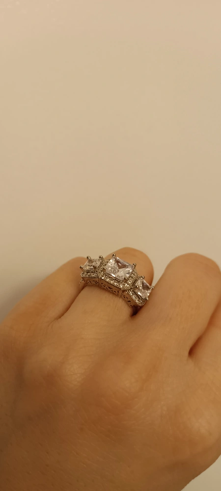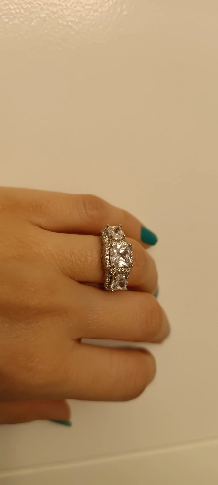 Stunning three-stone ring. Features three large square-cut cubic zirconia stones. Intricate halo and band design. Silver-toned metal.