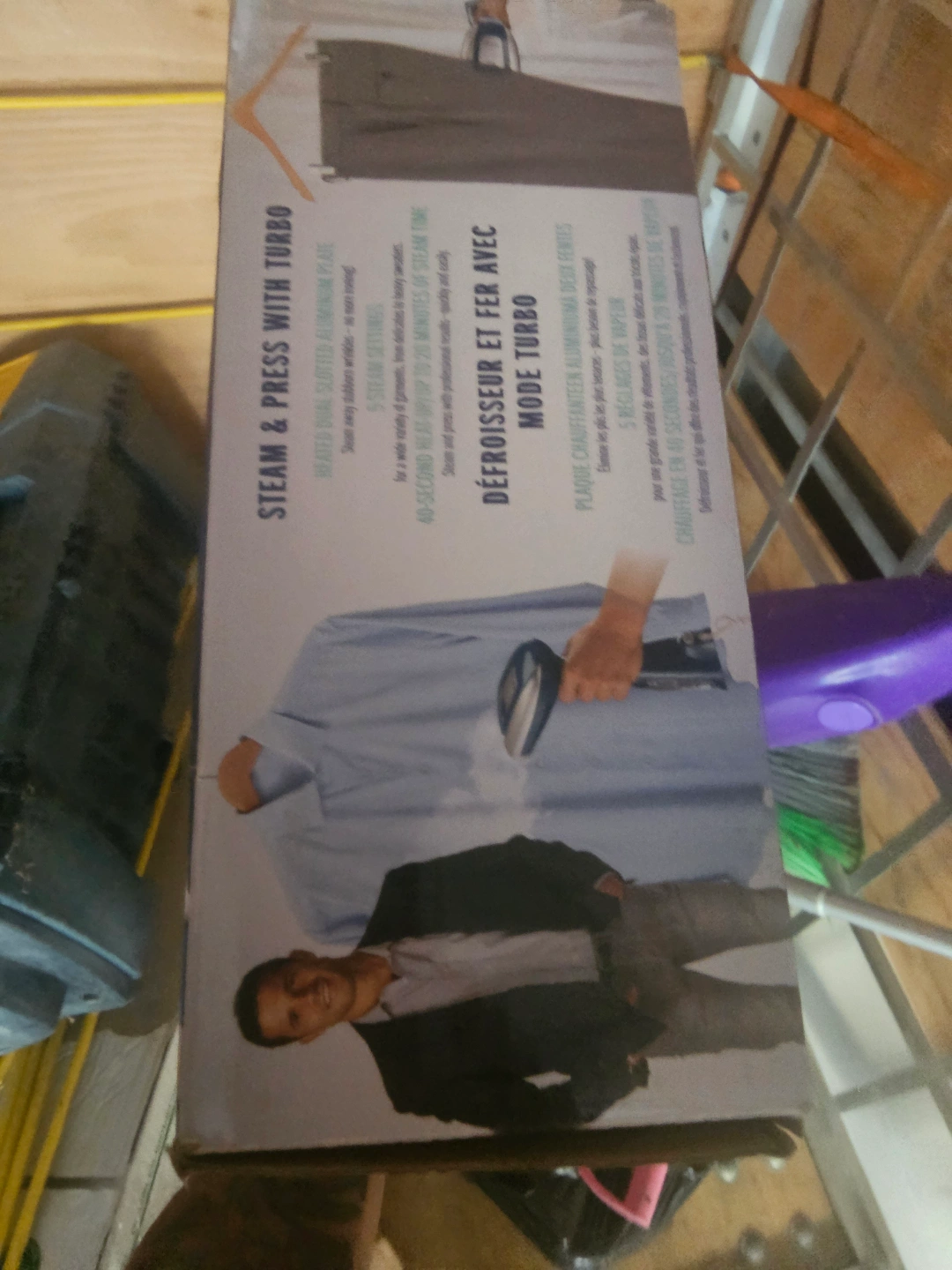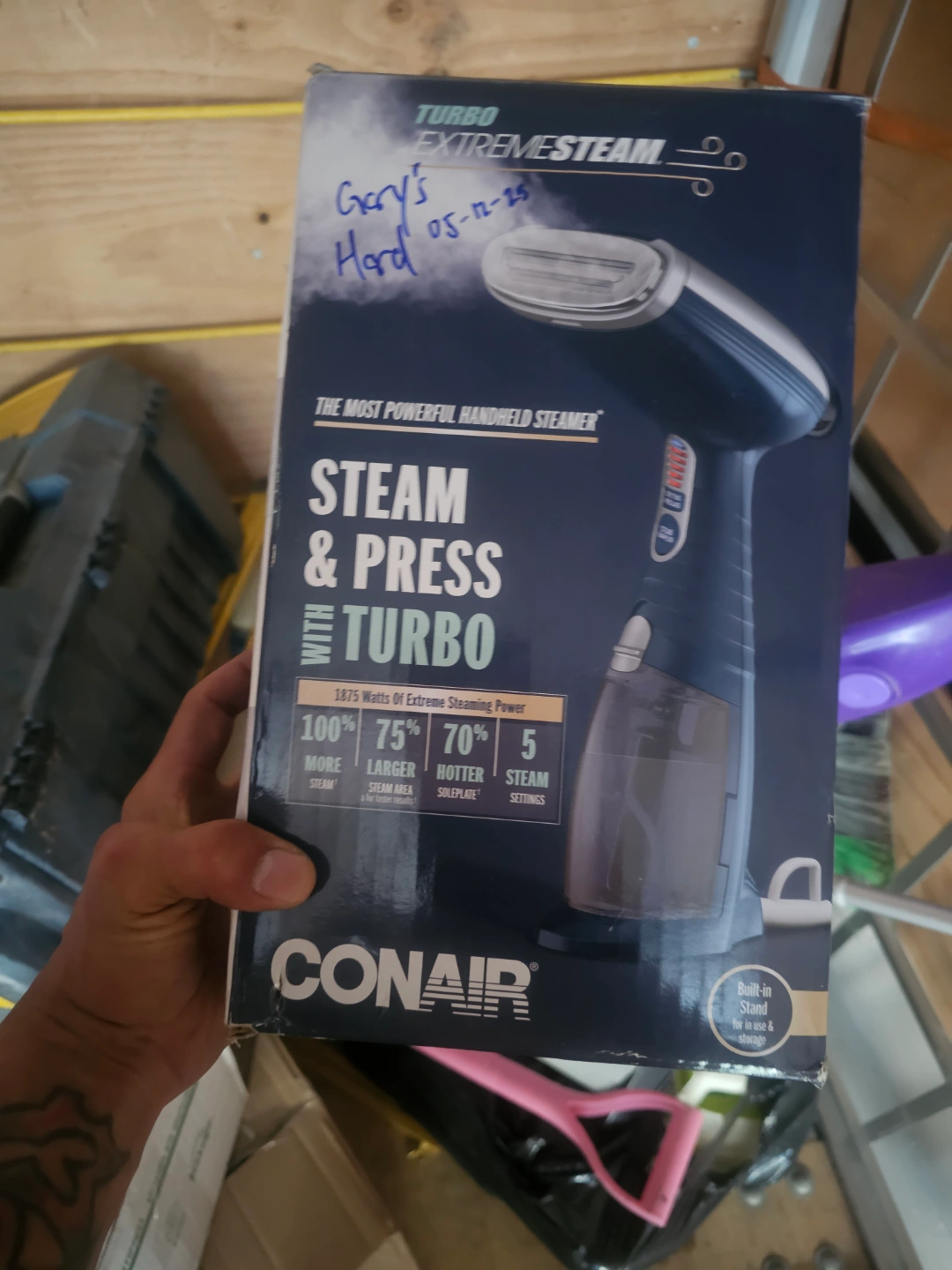 New in box Conair handheld garment steamer. Features 5 steam settings, turbo steam, and a built-in stand. Powerful handheld steamer with press function. Great for travel.