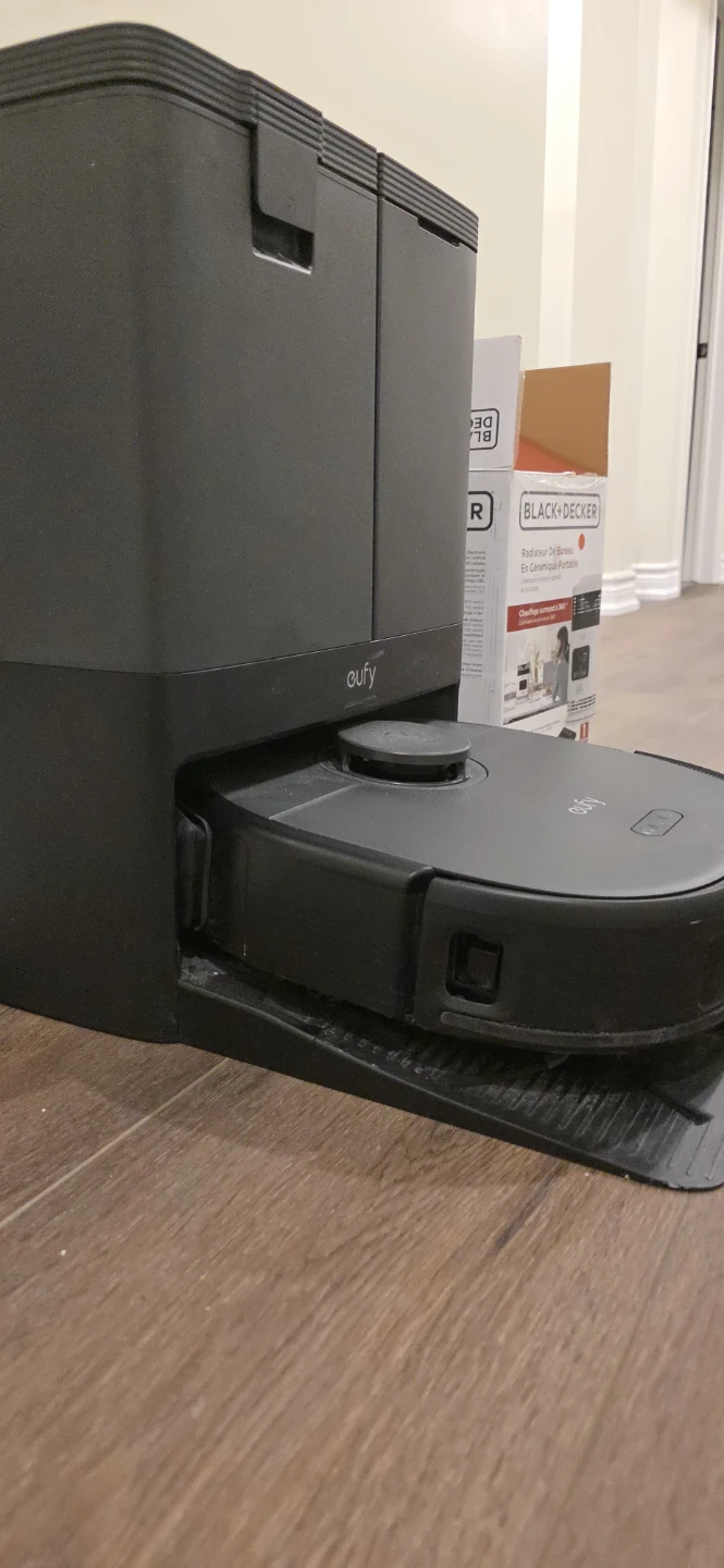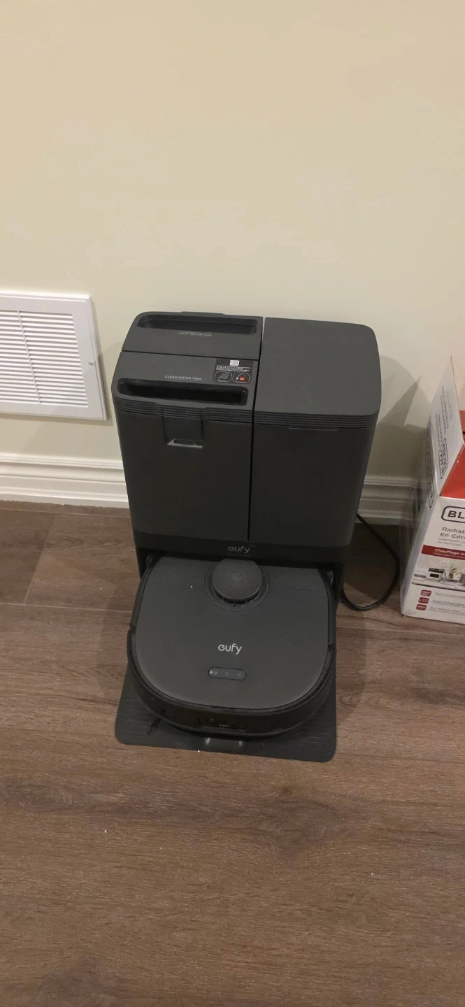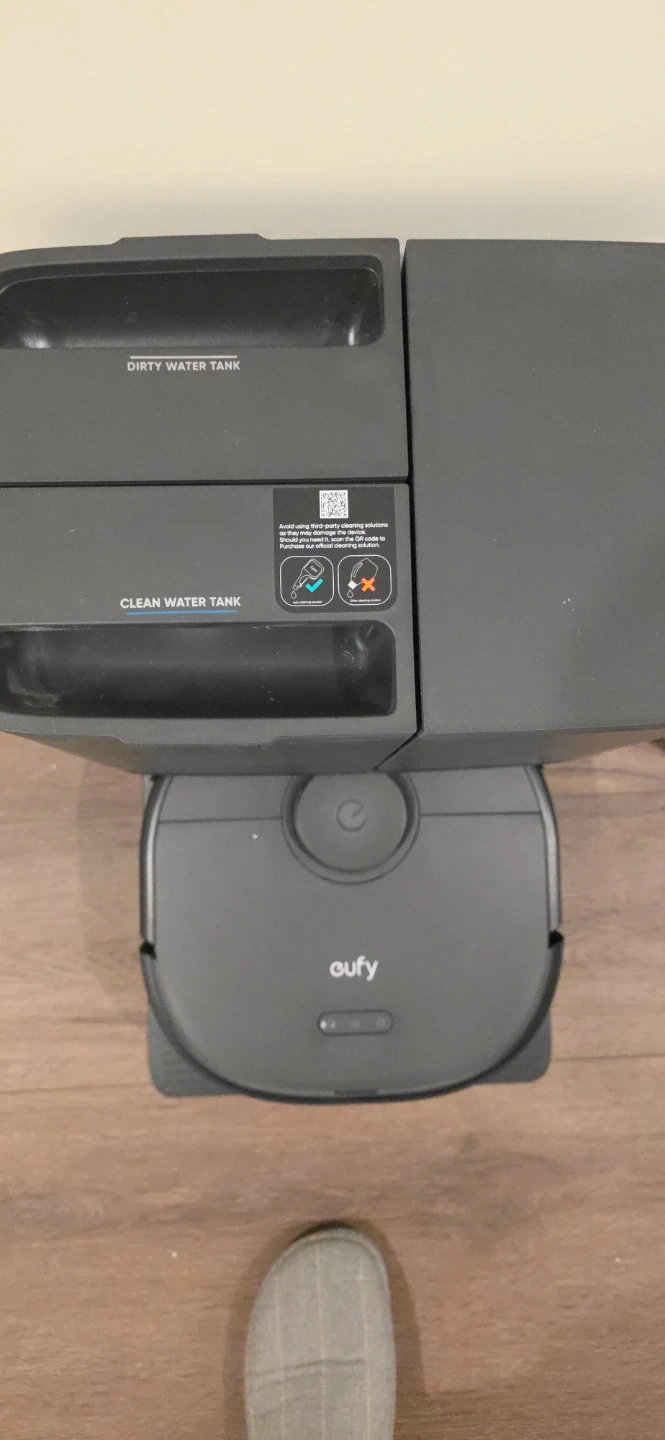 This Eufy RoboVac comes with a self-emptying base. It has separate tanks for dirty and clean water. It's designed for automated floor cleaning.