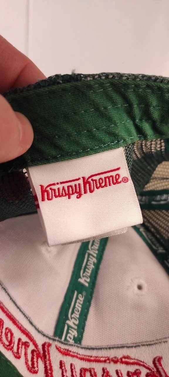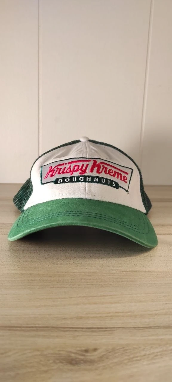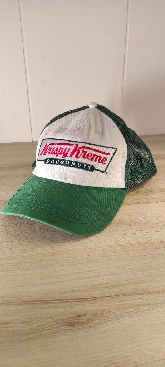 White and green trucker hat with the Krispy Kreme Doughnuts logo embroidered on the front. Mesh back for breathability. It's a classic promotional cap for any fan!