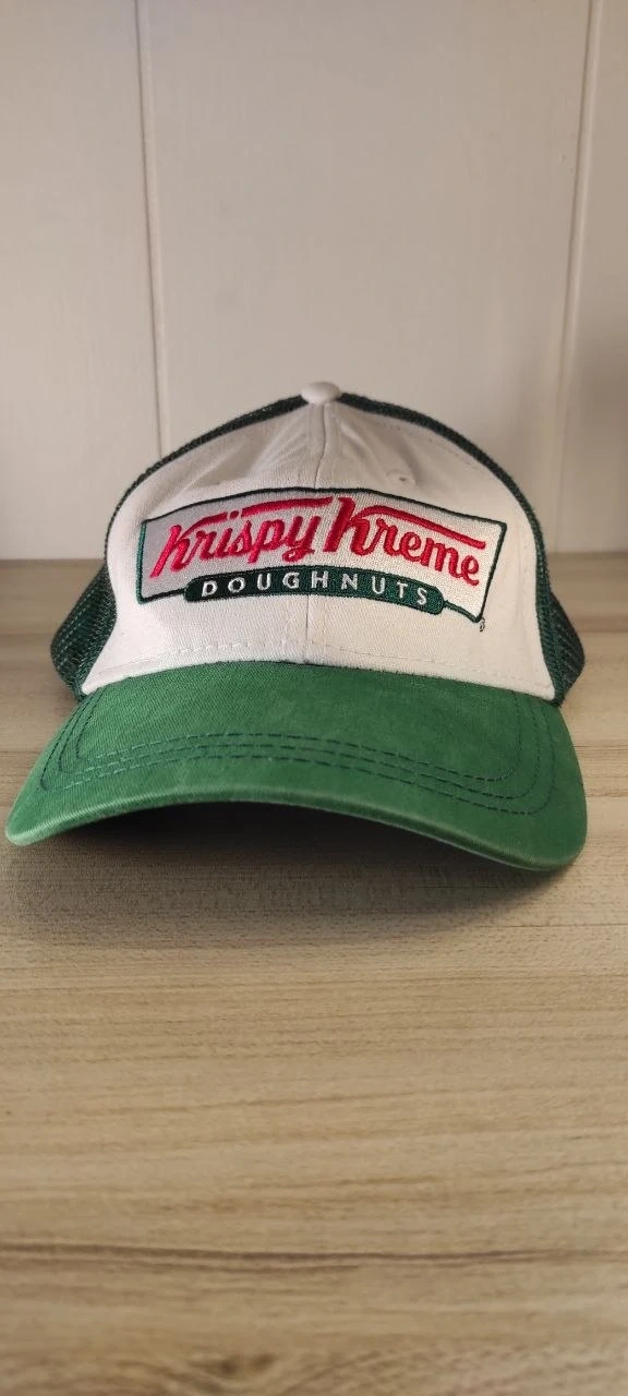 White and green trucker hat with the Krispy Kreme Doughnuts logo embroidered on the front. Mesh back for breathability. It's a classic promotional cap for any fan!