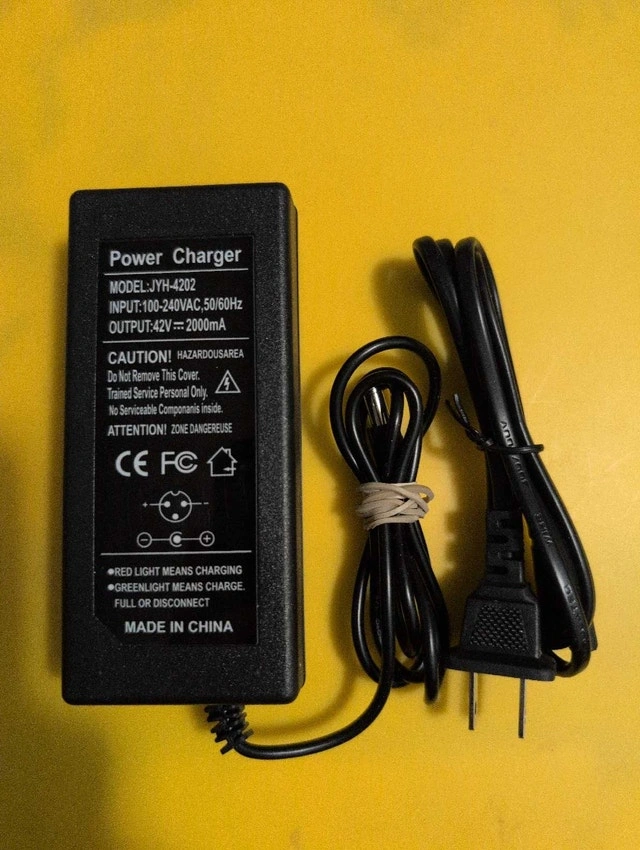 This is a brand new 42V battery charger for electric scooters and bikes. It has an output of 42V and 2000mA, suitable for various models. Input: 100-240VAC, 50/60Hz. Output: 42V 2000mA. If you're seeing this ad, the charger is still available.