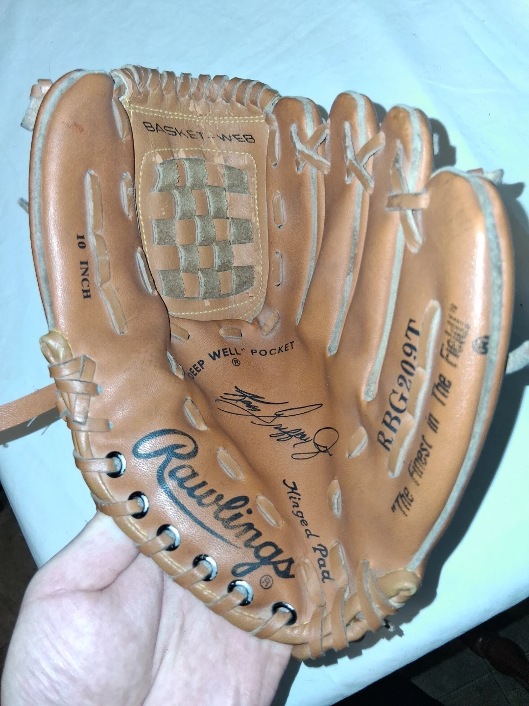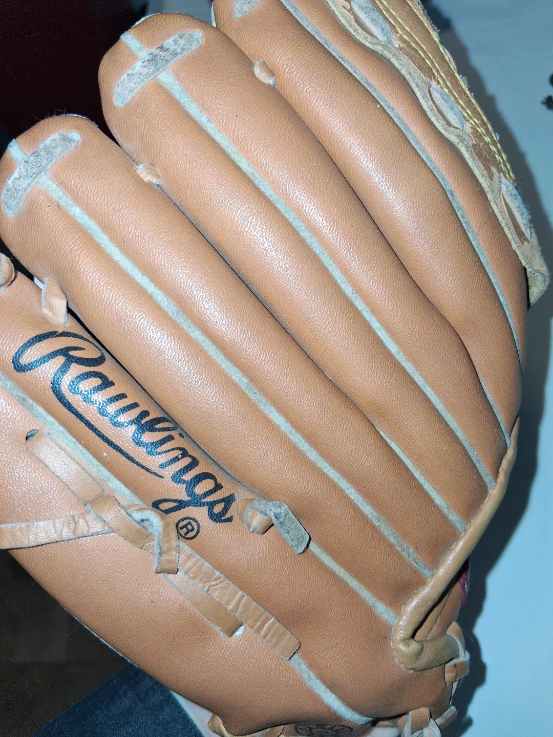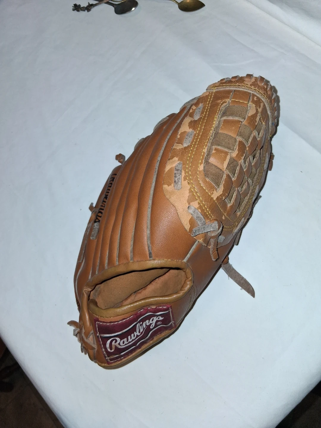 Brown Rawlings baseball glove with a 10-inch size. It features a basket web and deep well pocket. This glove's finest in the field!