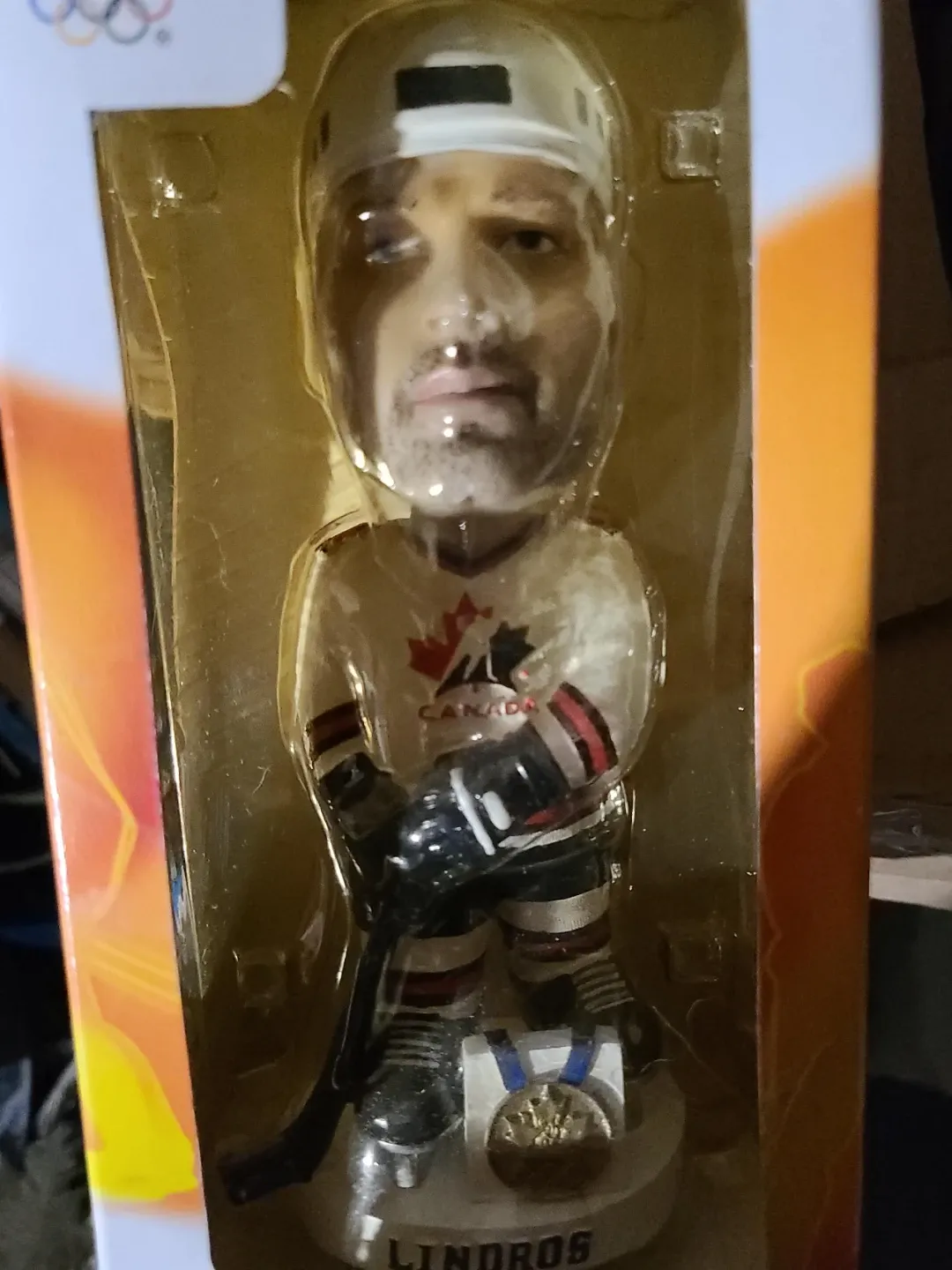Eric Lindros bobblehead dressed in a Canada hockey jersey. It features a medal at the base and the player's name "LINDROS" is displayed. This collectible is in its original packaging.