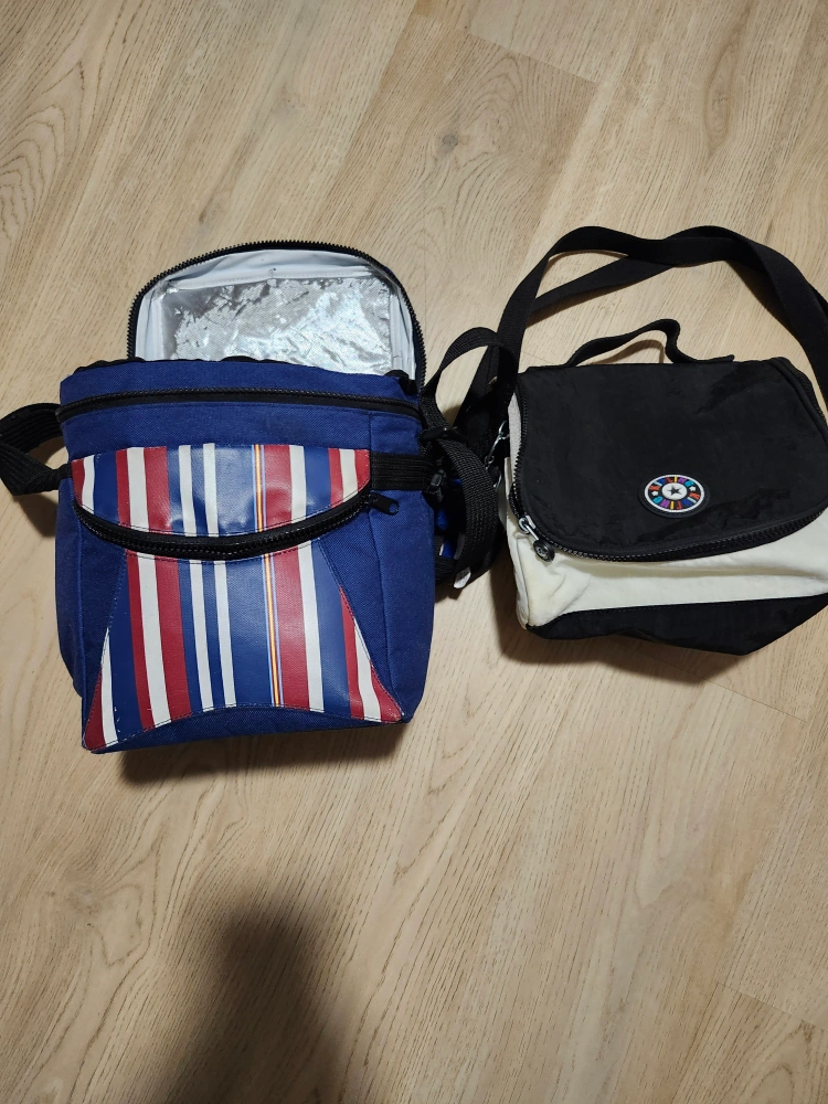 Set of two bags. One is an insulated lunch bag with red, white, and blue stripes. The other is a small black and white shoulder bag. Both used but still has alot of life. pick up only