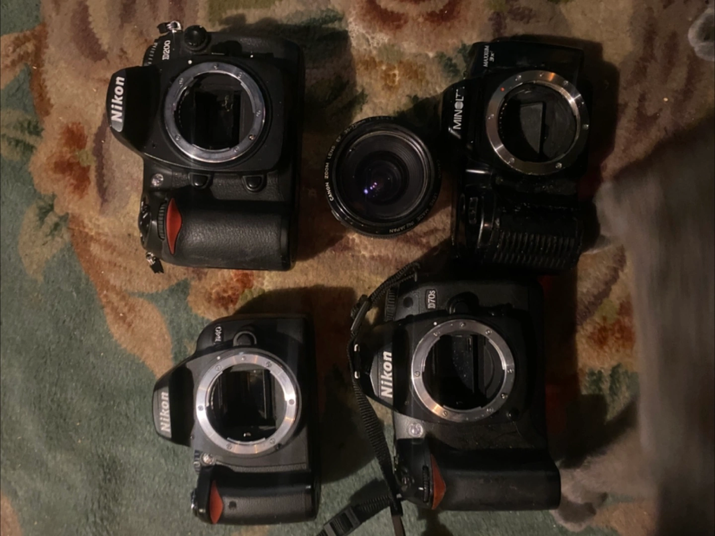 Selling a mixed lot of camera bodies including Nikon D200, Nikon D70s, Nikon 1140, and a Minolta Maxxum 3x. Good for parts or repair for someone who knows cameras!