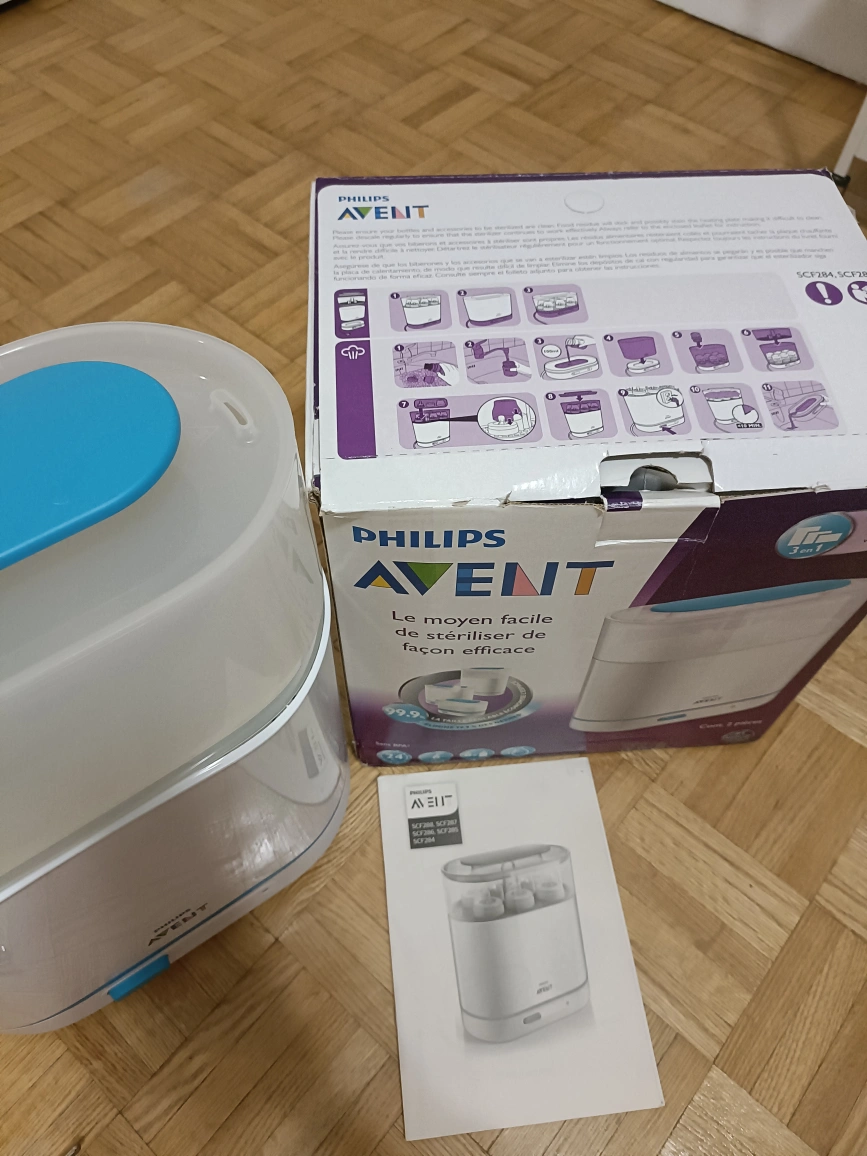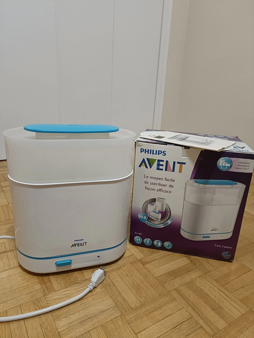 Selling a Philips Avent 3-in-1 electric steam sterilizer in excellent condition. It's a handy way to sterilize baby bottles and other small items quickly and safely. Comes with the original box and all components