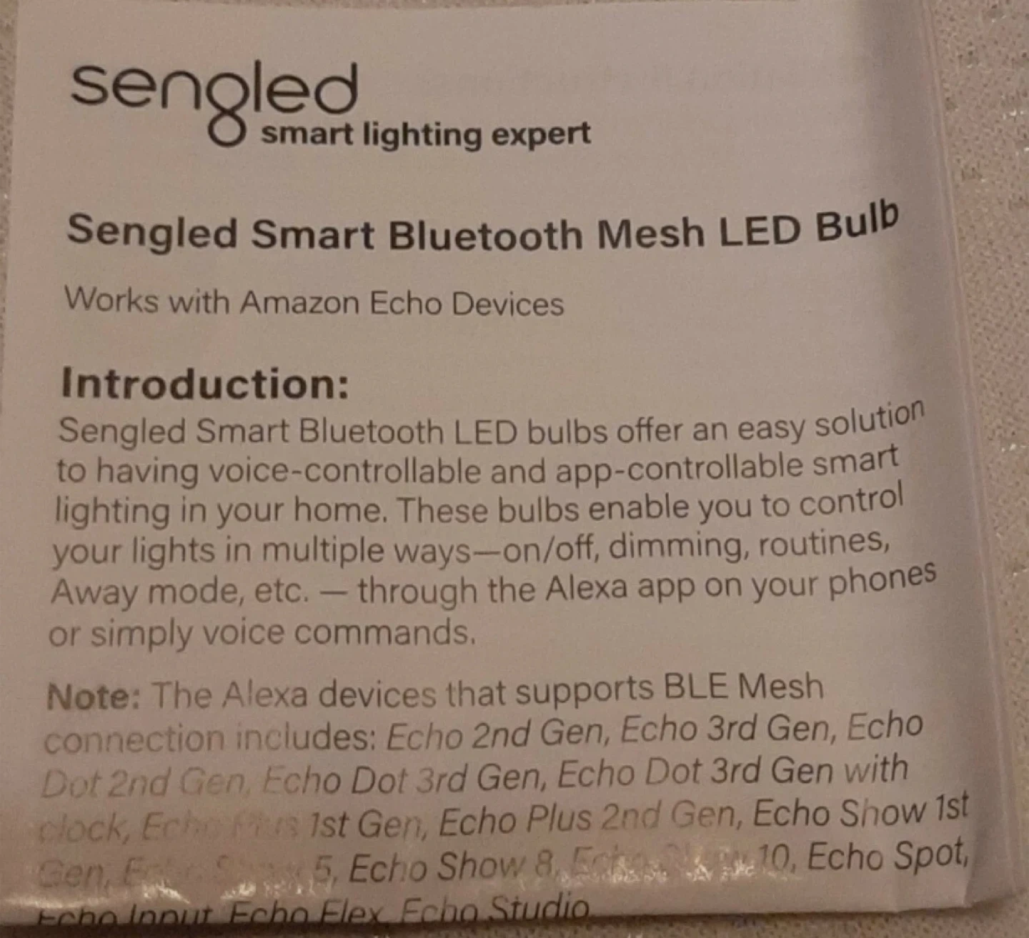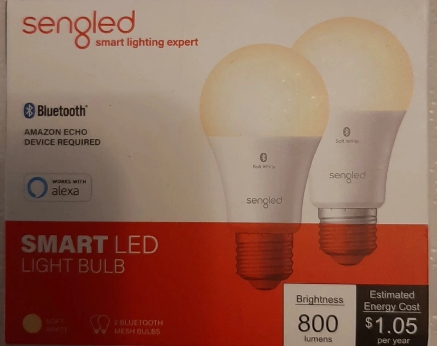This is a 2-pack of Sengled Smart LED light bulbs. They work with Alexa and require an Amazon Echo device. Each bulb is 800 lumens and has a color temperature of 2700K.