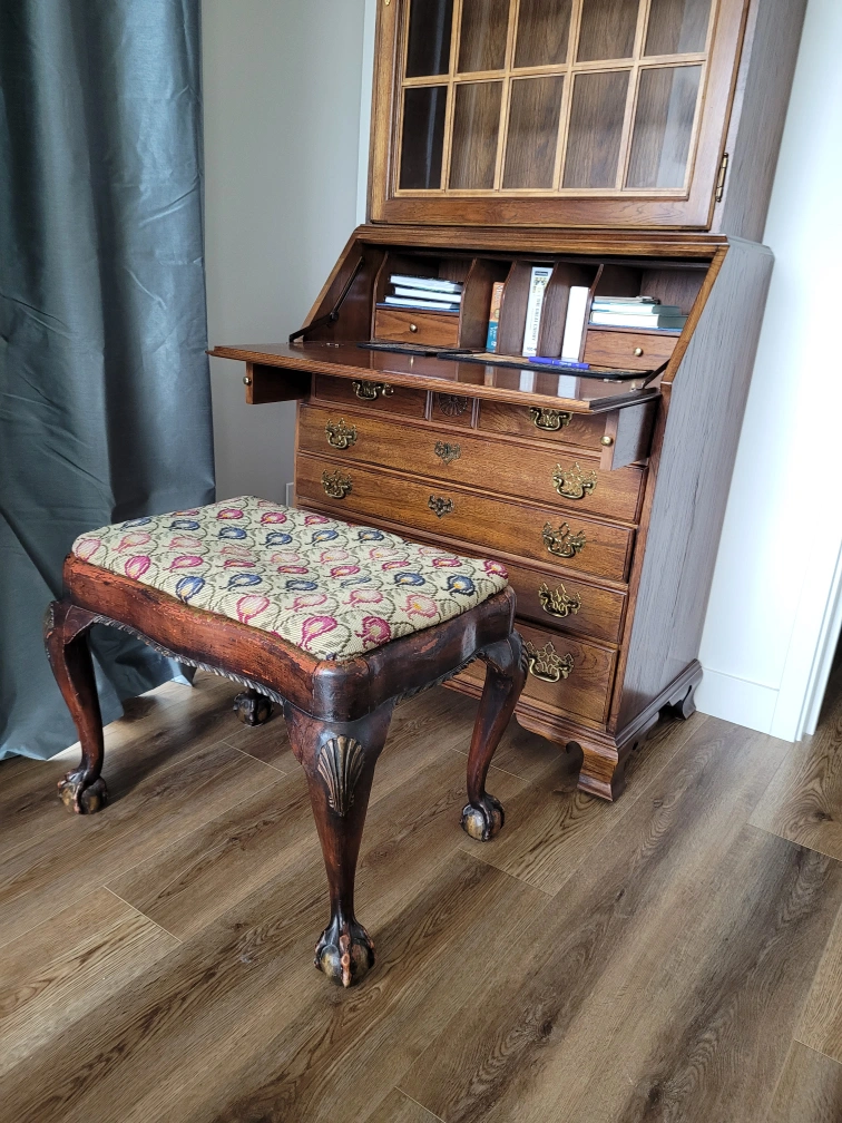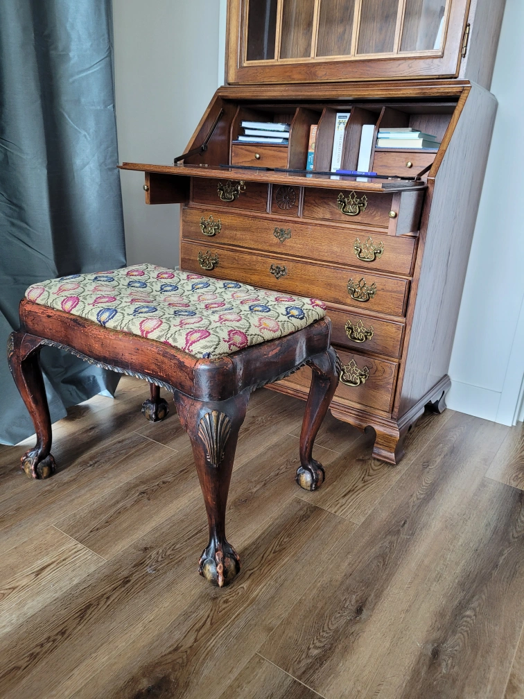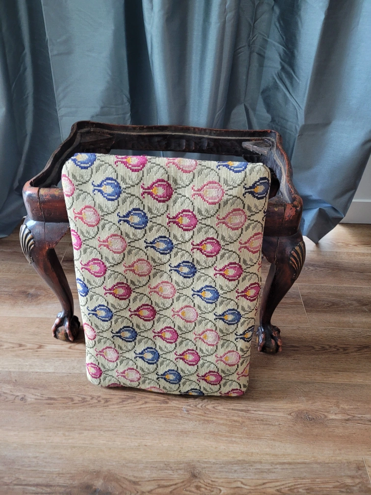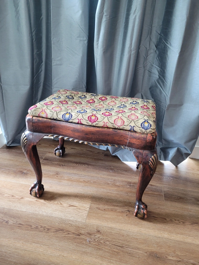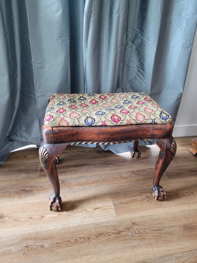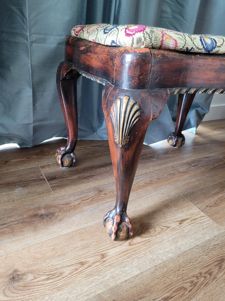 Pretty original petitpoint seat is separate from base, so recovering would be easy if desired. Claw style legs with gold detailing are impressive. This lovely piece is slightly larger than most antique footstools.