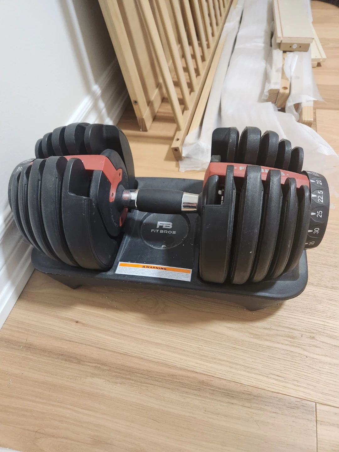 This Fit Bros adjustable dumbbell offers a weight range up to 52.5 lbs. It's designed for convenient home workouts. Adjusting the weight is simple by turning the dial. Lightly used
