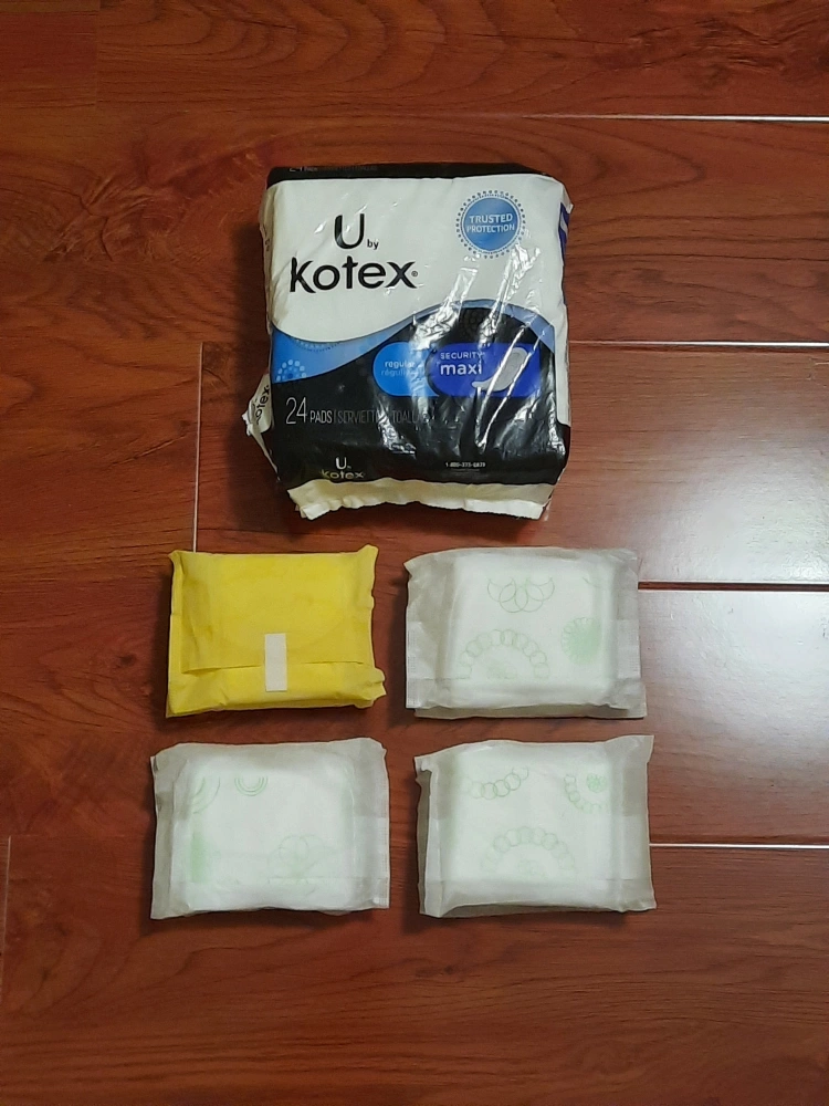 1 package of U by Kotex Security Maxi Pads (package opened but all 24 pads are inside plus an additional 8 pads) 6 single Kotex maxi pads, 2 Always maxi pads. 32 pads in total.