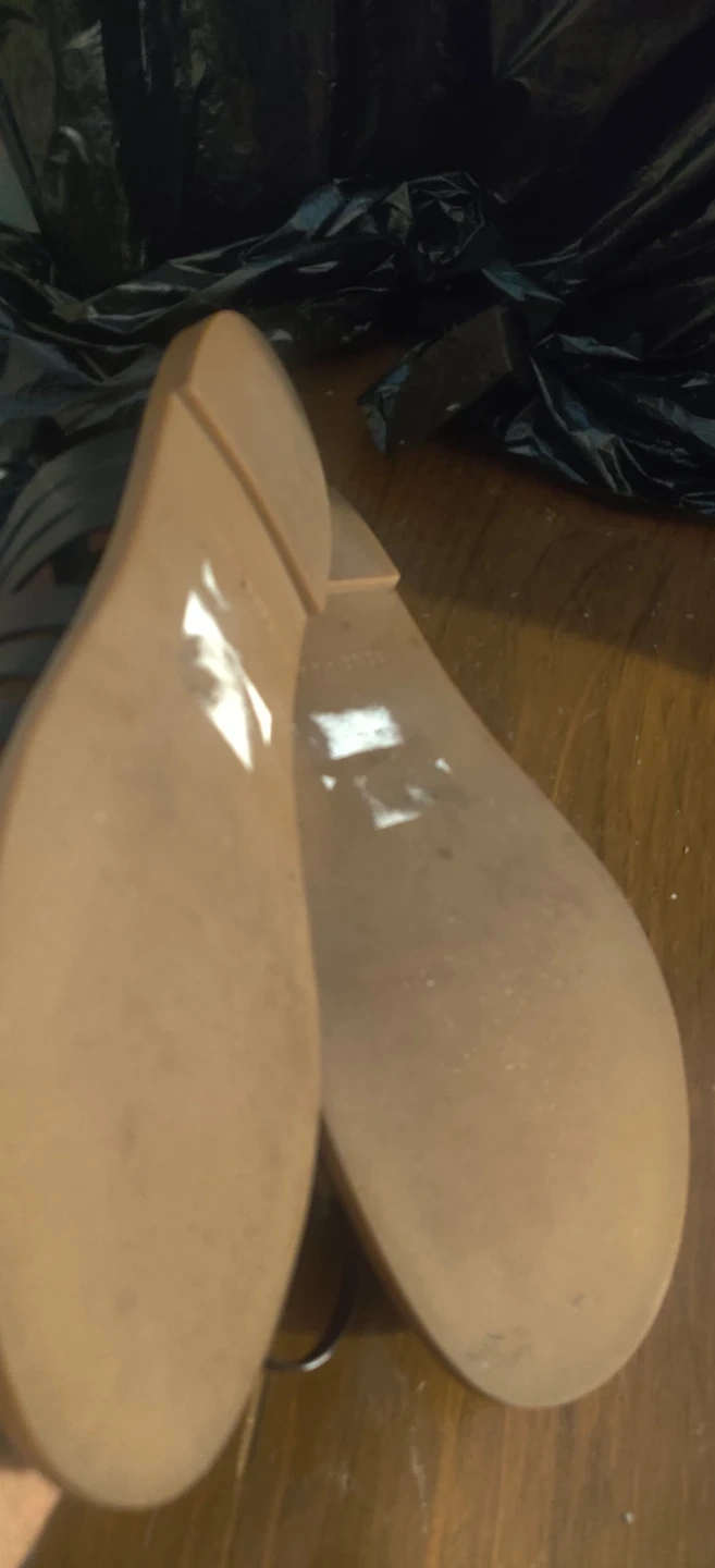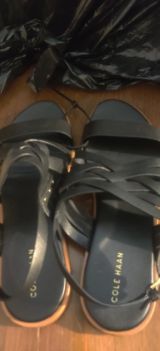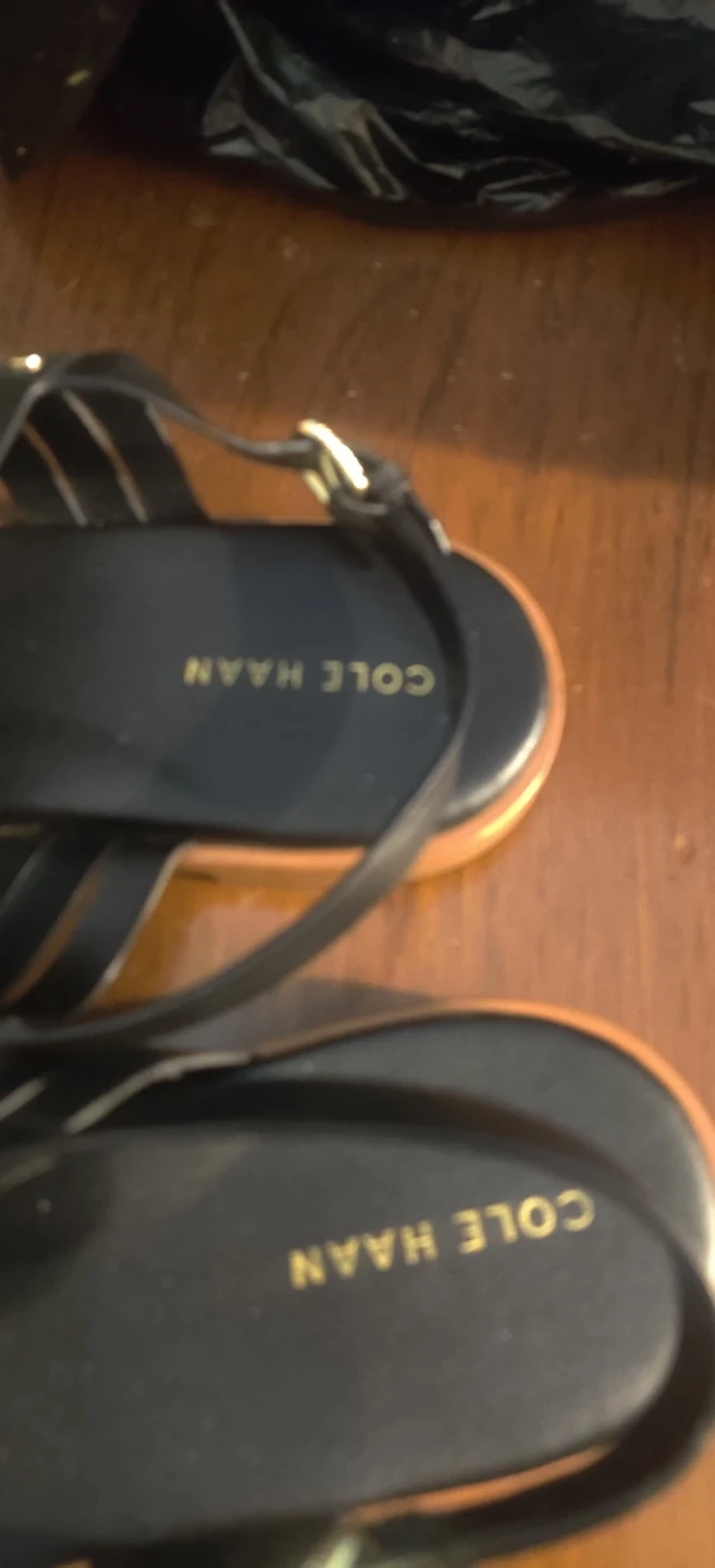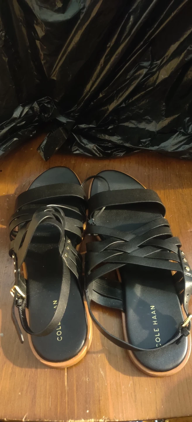 Cole Haan black leather strappy sandals. These sandals have a flat sole with a buckle closure for adjustability. Material is leather with a wooden-toned sole.Worm twice