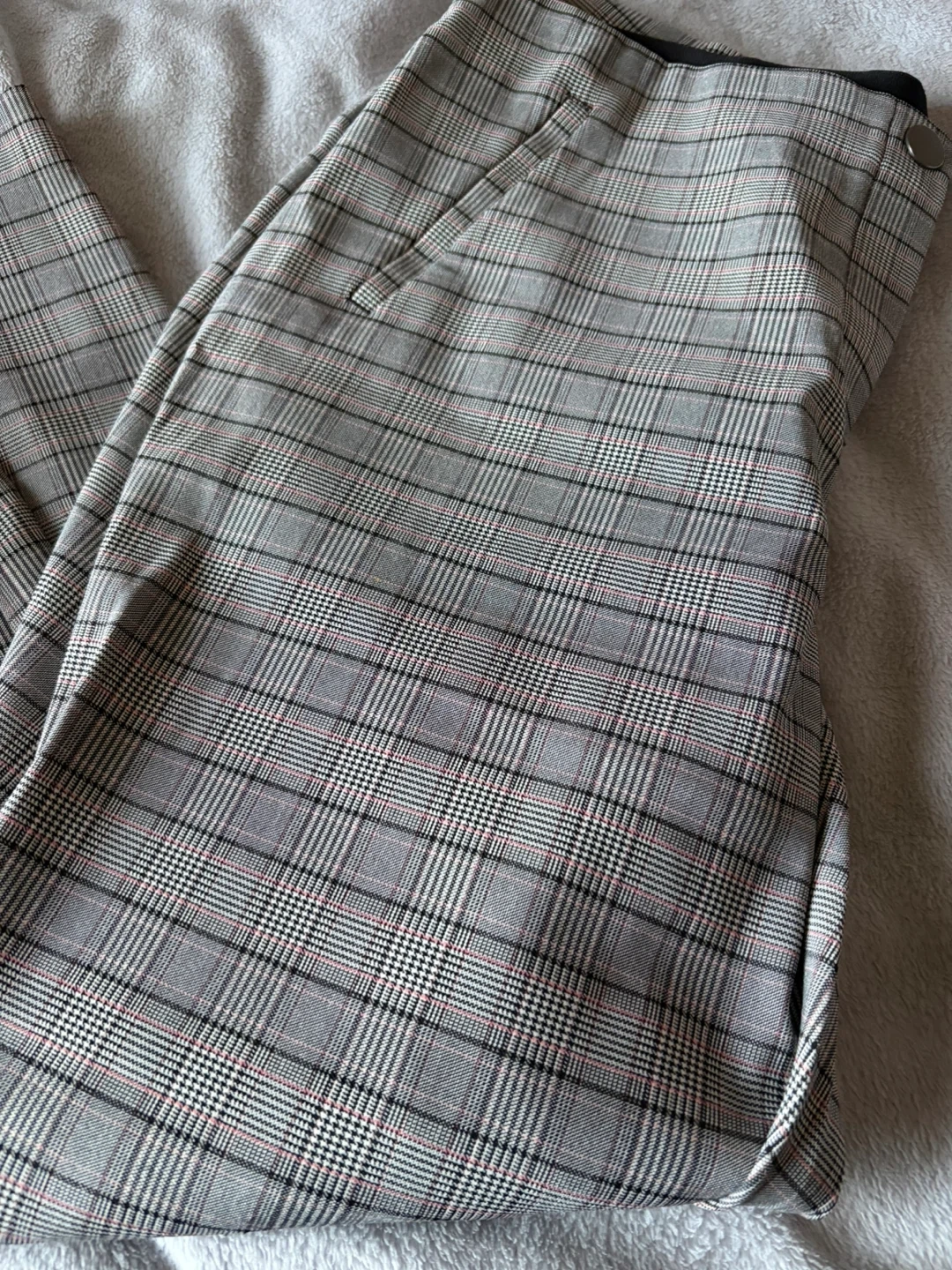 These stylish women's pants feature a classic grey plaid pattern with subtle pink and black accents. They have a comfortable fit and a flattering design. Great for a casual day out or dressing up for work!