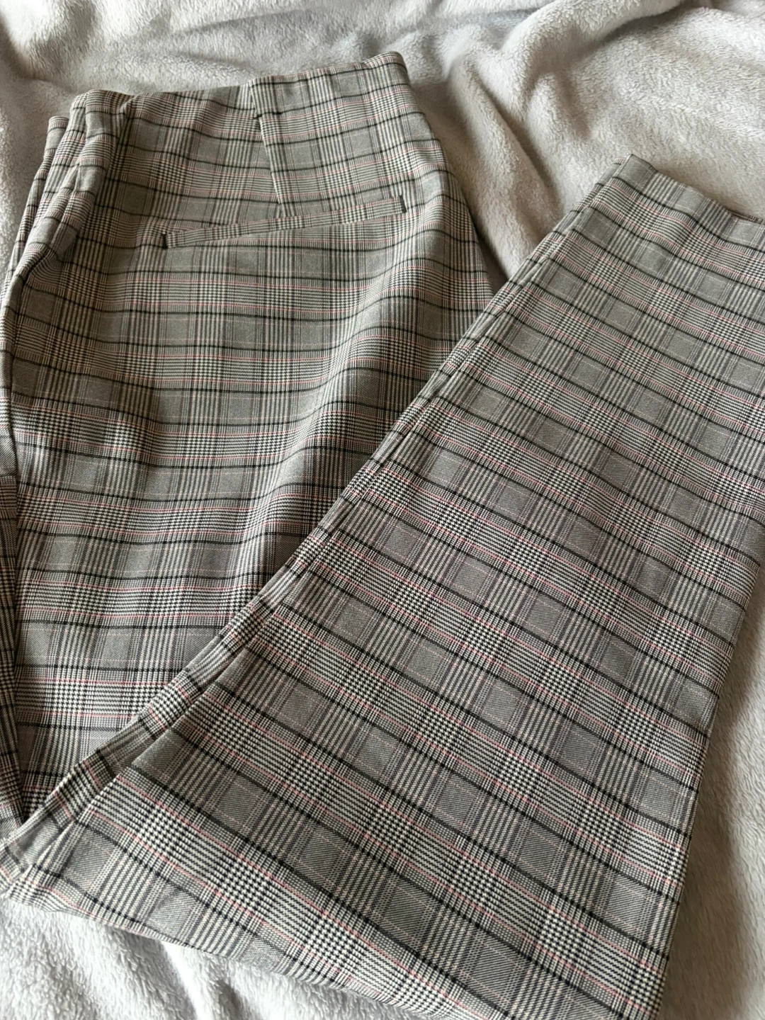 These stylish women's pants feature a classic grey plaid pattern with subtle pink and black accents. They have a comfortable fit and a flattering design. Great for a casual day out or dressing up for work!