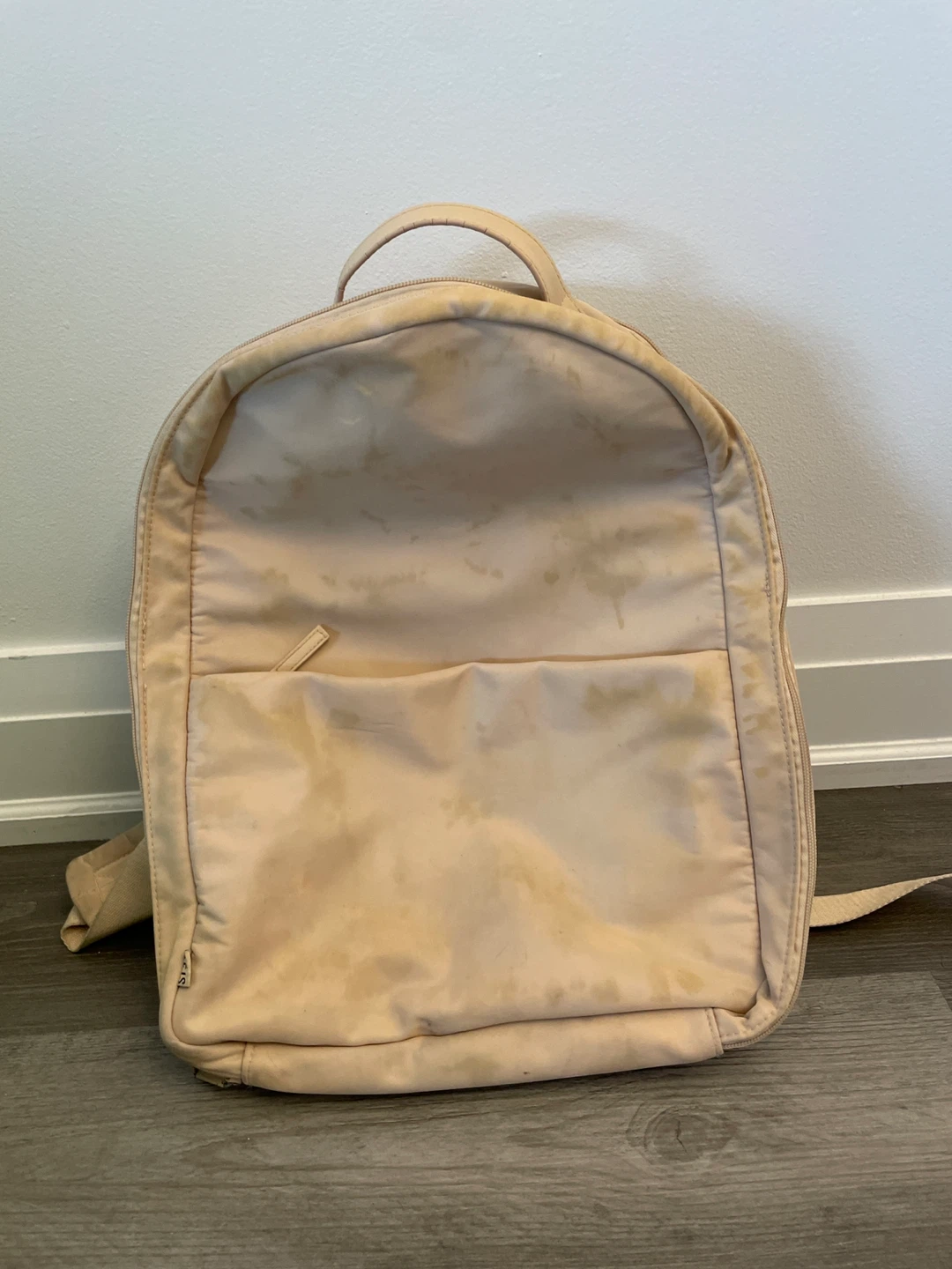Selling a beige pink Beis backpack. It has a top handle and adjustable straps. There are some detergent stain marks on the front and back, as shown in the pictures.