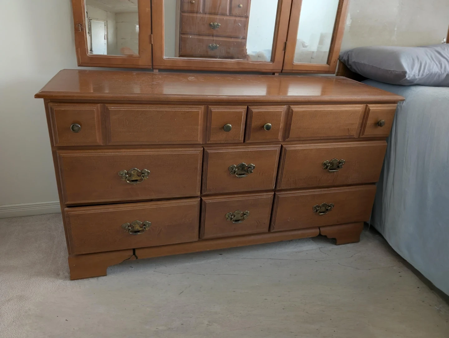 A nice wooden dresser with a tri-fold mirror. It has nine drawers for ample storage. This dresser would be useful for organizing clothes and personal items.