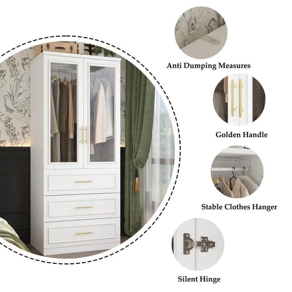 Brand new, factory-sealed white wood wardrobe with 2 doors, hanging rod, and 3 drawers. Modern design with tempered glass doors, sturdy MDF construction, and anti-tipping safety feature. Durable, easy-to-clean finish—perfect for bedroom storage and organization.