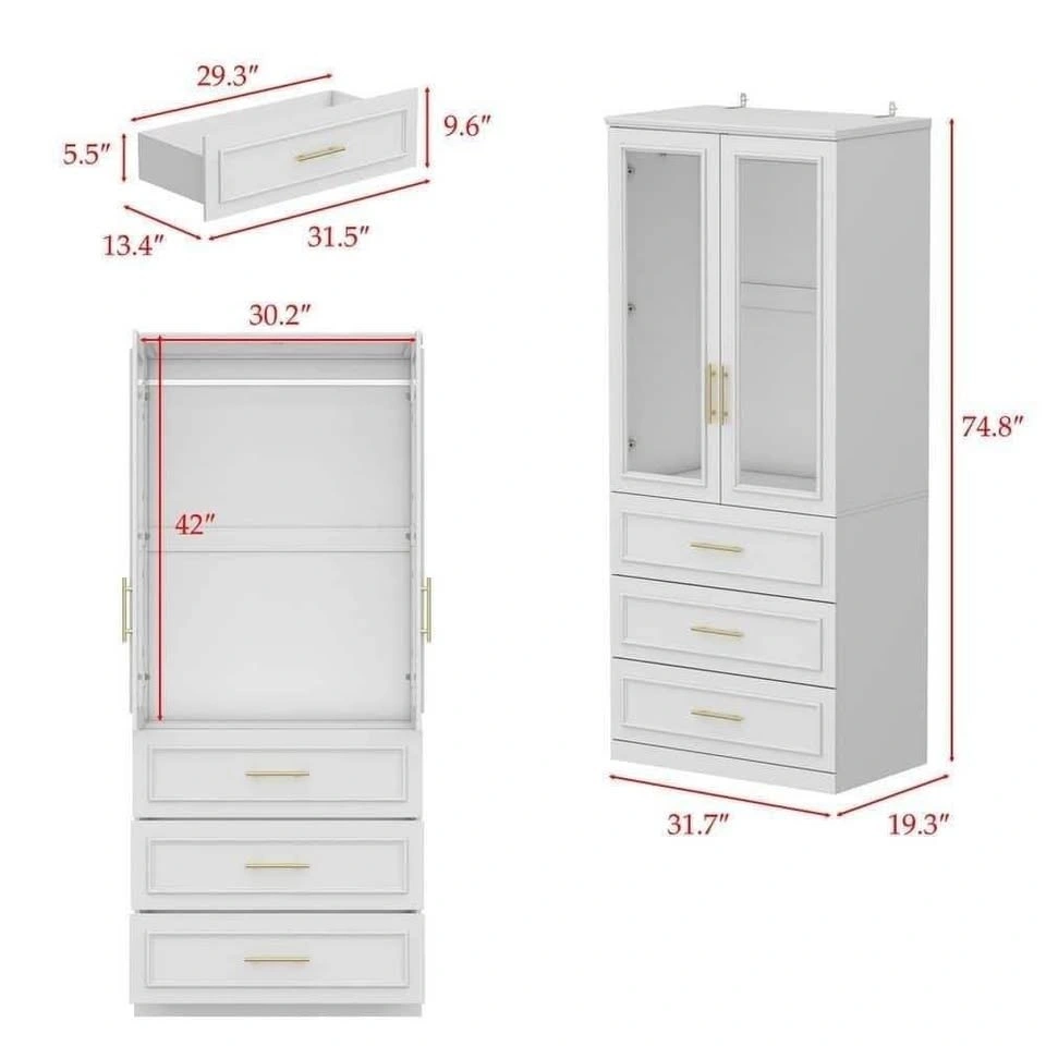 Brand new, factory-sealed white wood wardrobe with 2 doors, hanging rod, and 3 drawers. Modern design with tempered glass doors, sturdy MDF construction, and anti-tipping safety feature. Durable, easy-to-clean finish—perfect for bedroom storage and organization.